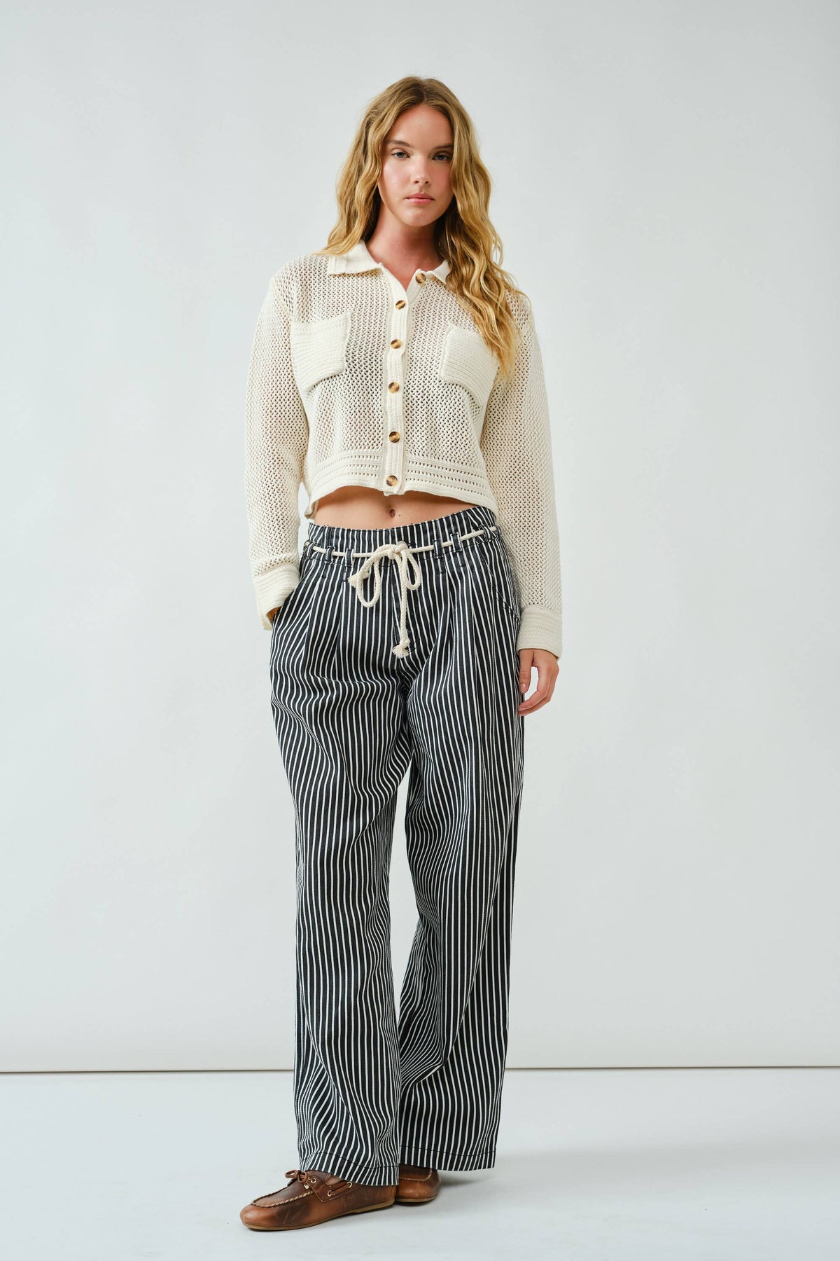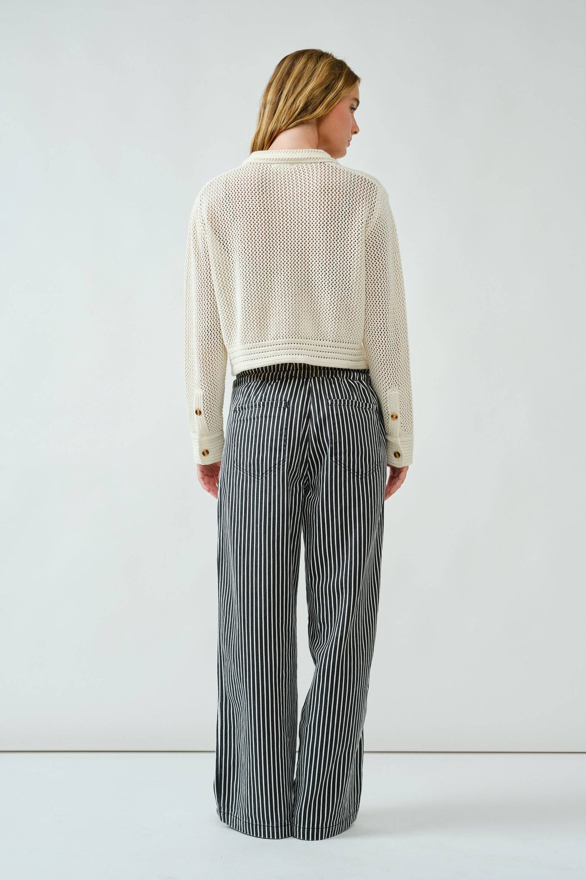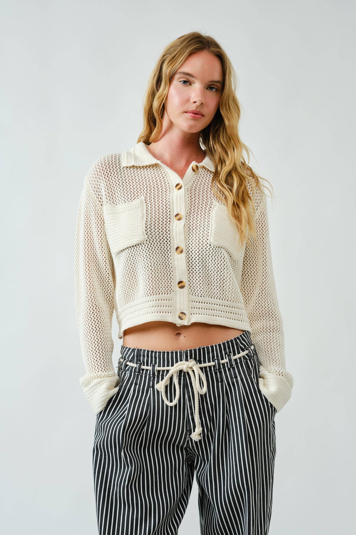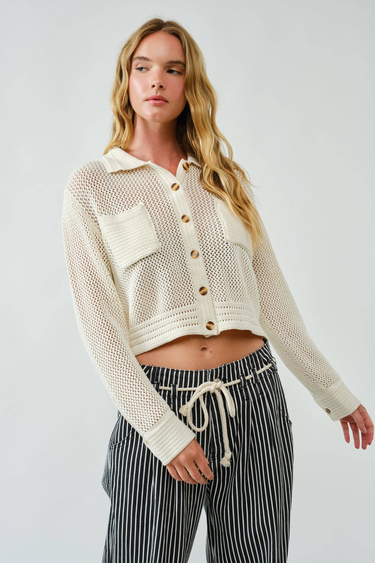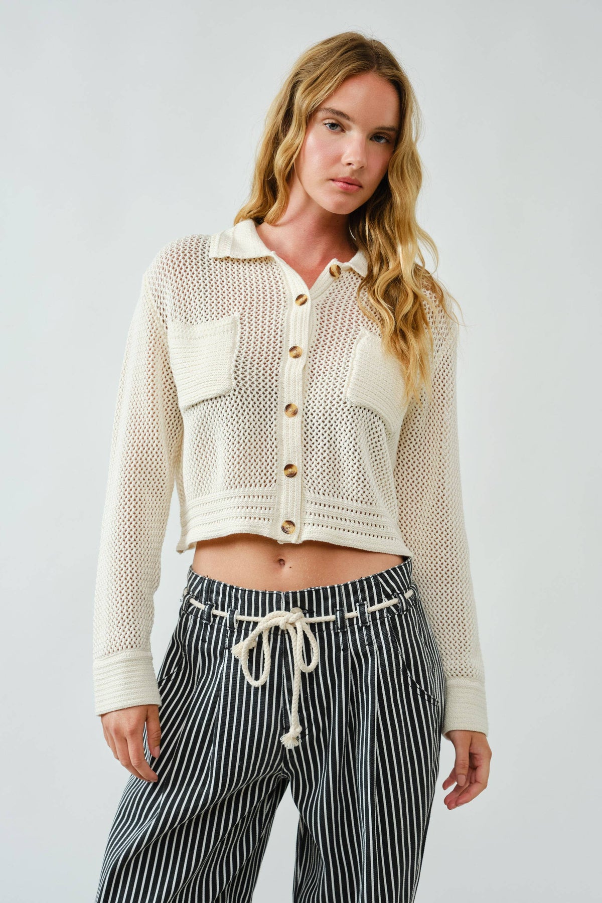 This crocheted cotton cardigan brings a modern twist to a vintage-inspired silhouette. Featuring an open-knit texture, wooden-style buttons, and a cropped length, it’s perfect for layering over tanks or bralettes. The structured collar and chest patch pockets add a touch of shirt-like polish, while the breathable cotton blend makes it ideal for warm-weather styling.