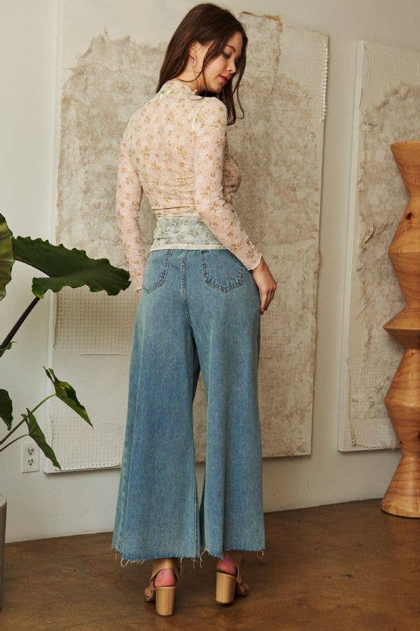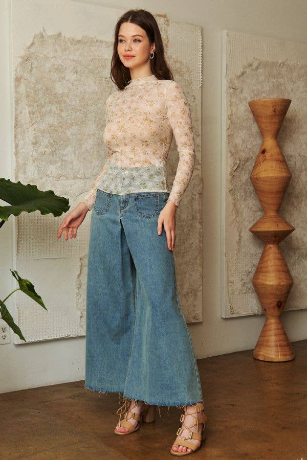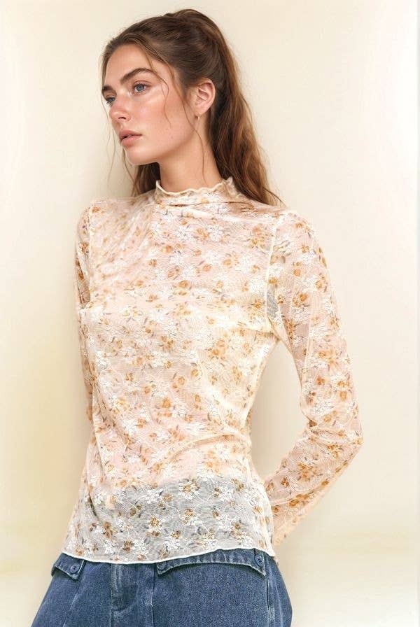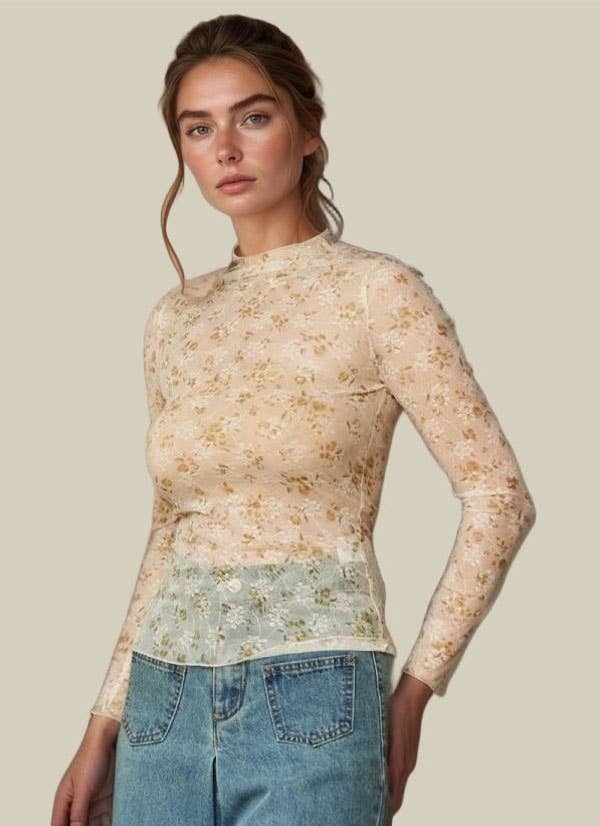 LOOSE TURTLE NECK FLORAL BOUCHET PRINTED LACE STRETCH MESH LACE SHEER TOP 95%POLYESTER 5%SPANDEX Model is wearing Small Height: 5'8" Bust : 32B Waist : 23" Hips : 34"
