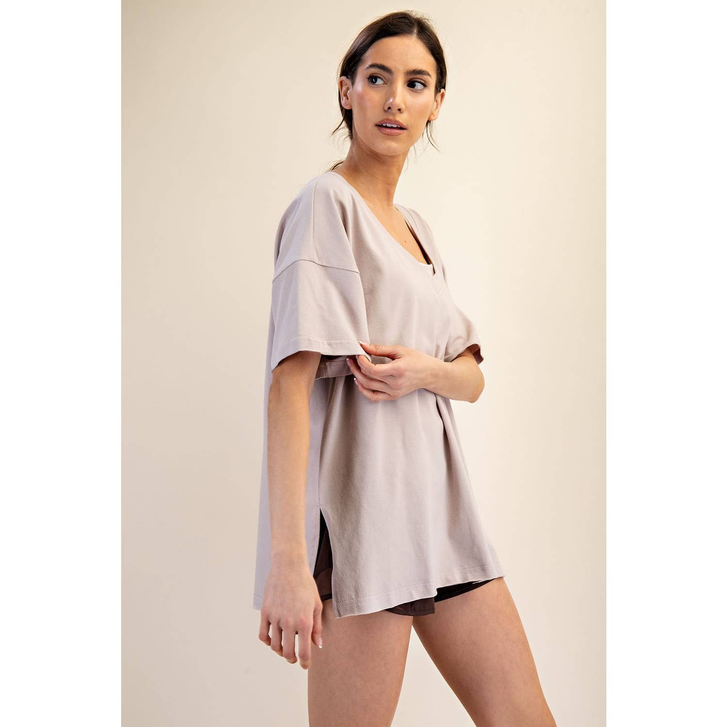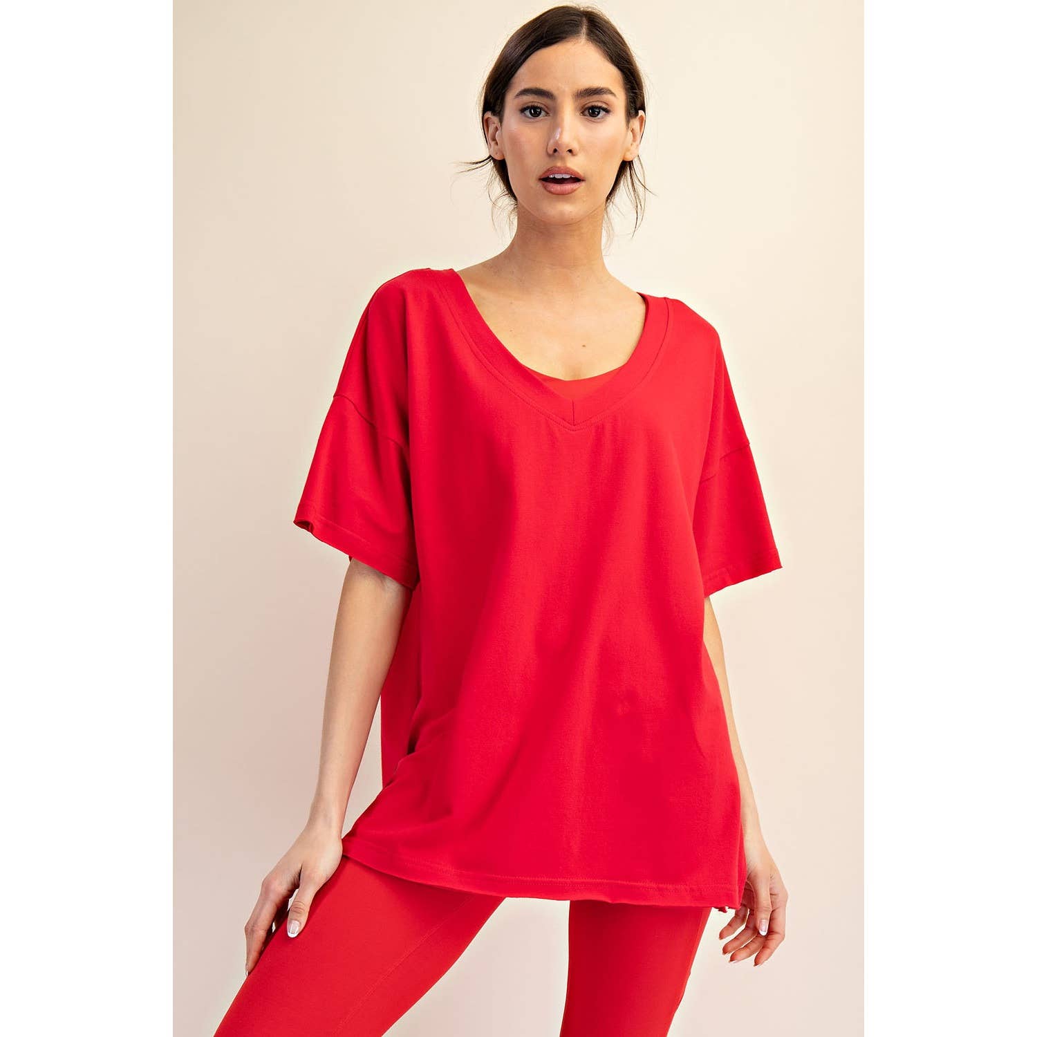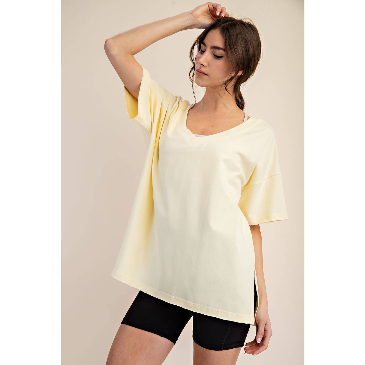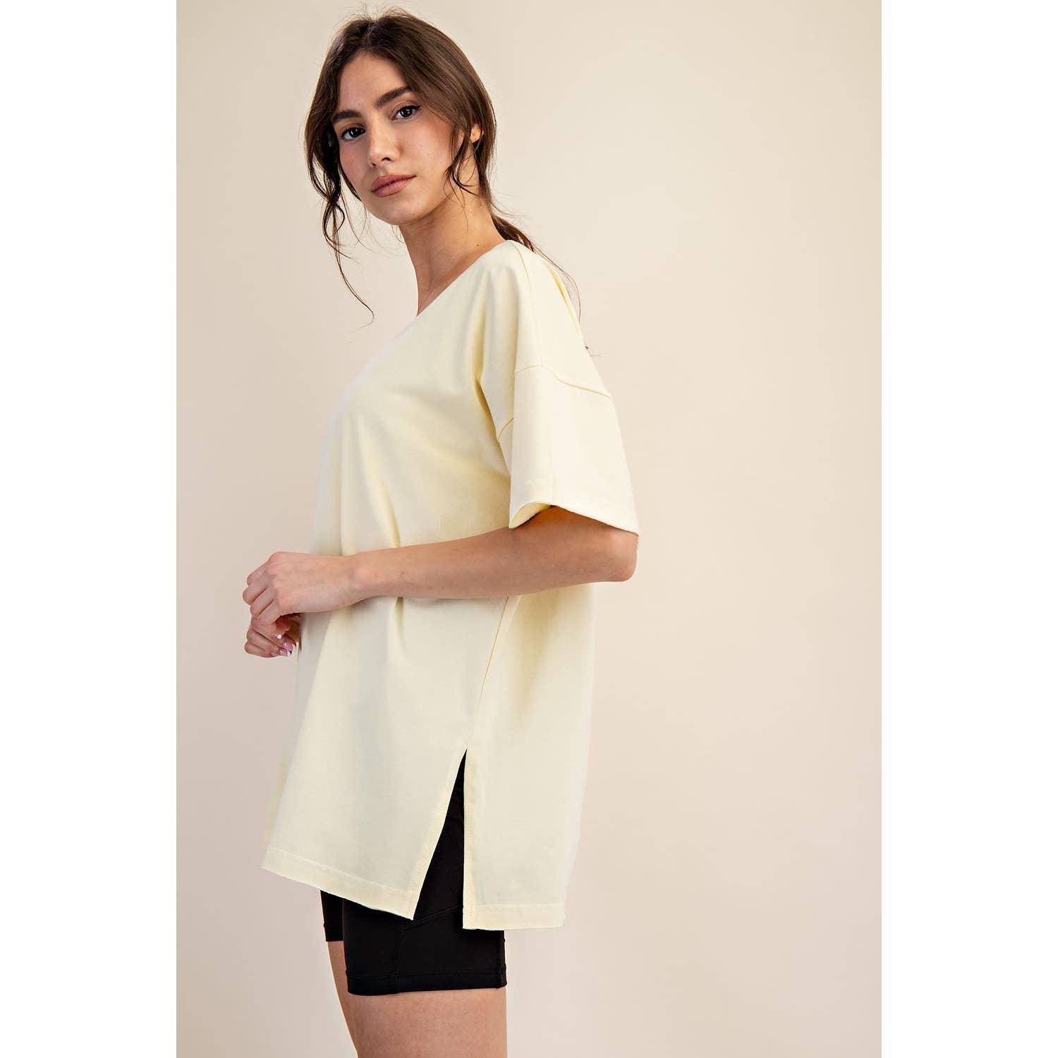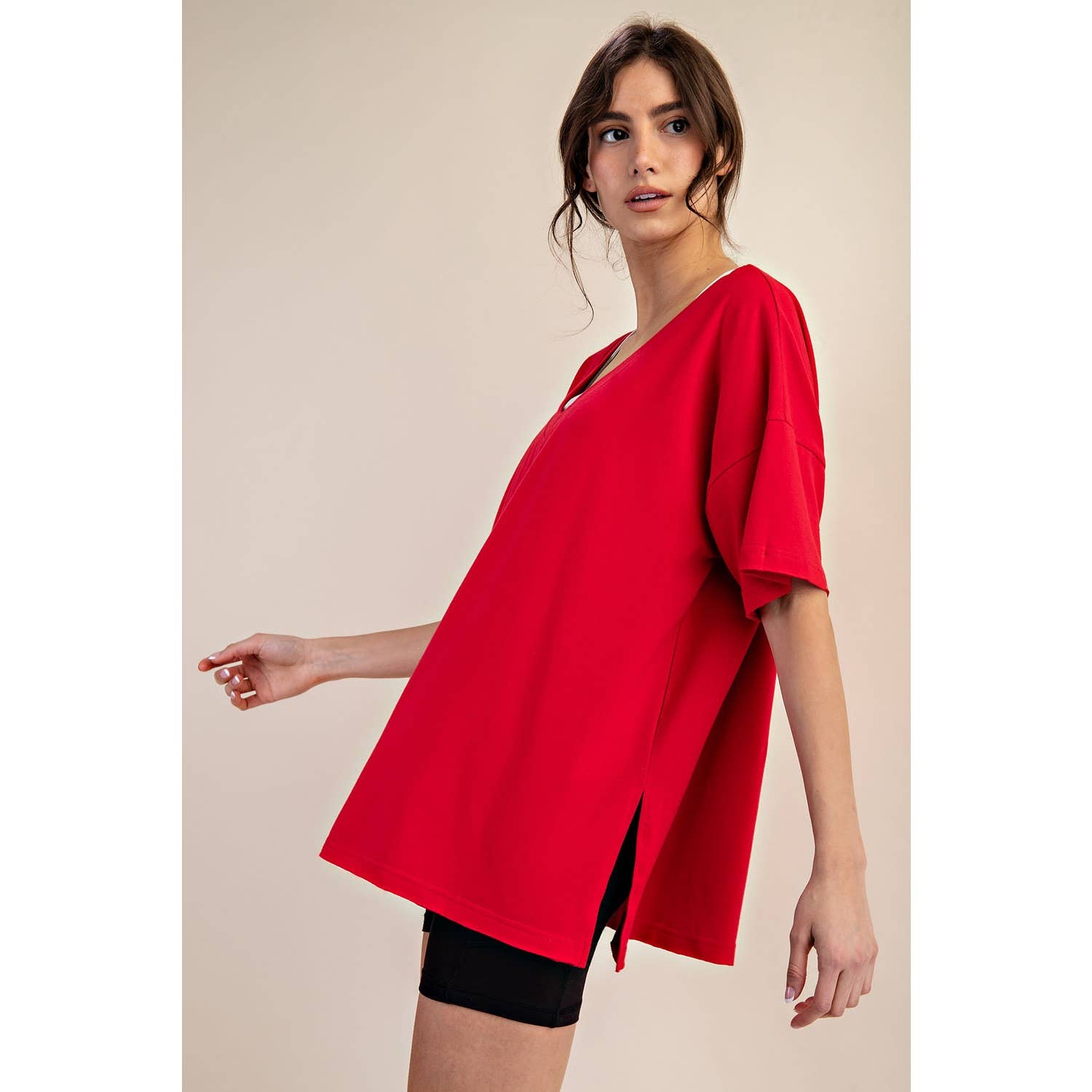Elevate your wardrobe with this oversized short sleeve top. Designed with a reversible style for versatile wear, it offers a soft, stretchy fit and a relaxed silhouette perfect for effortless, everyday comfort. Features: - Cotton Lycra fabric - 4-way stretch - Relaxed fit / Oversized - Short sleeve - Dropped shoulder - V neck / Round neck - Side slit Model is 5'8" and wearing size Small. Fabric: 95% Cotton, 5% Spandex C.O.O: Domestic
