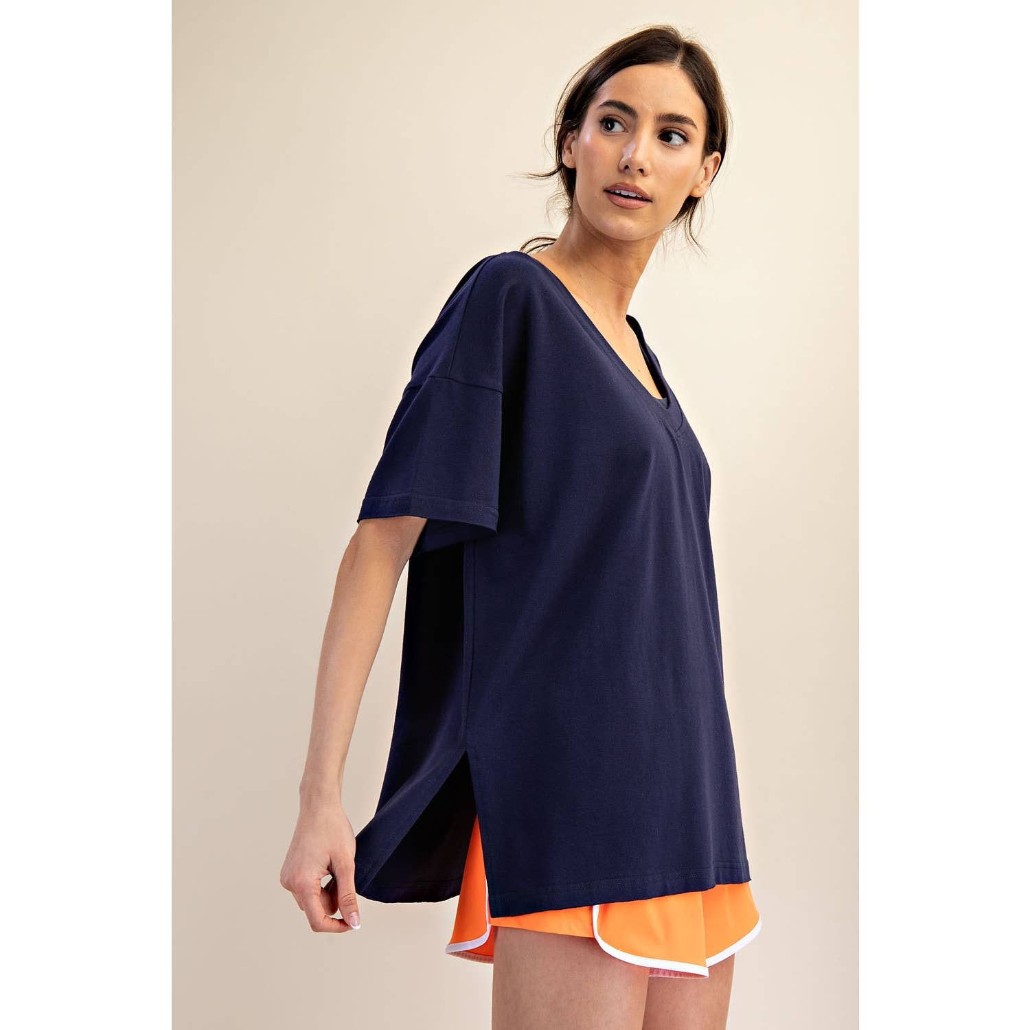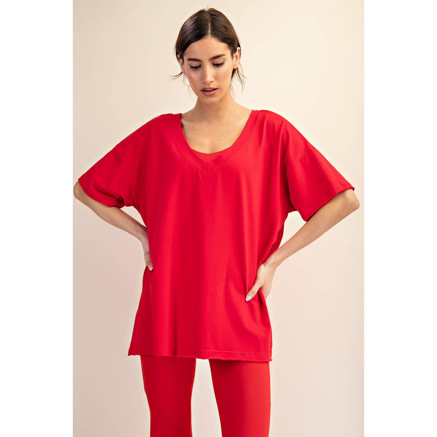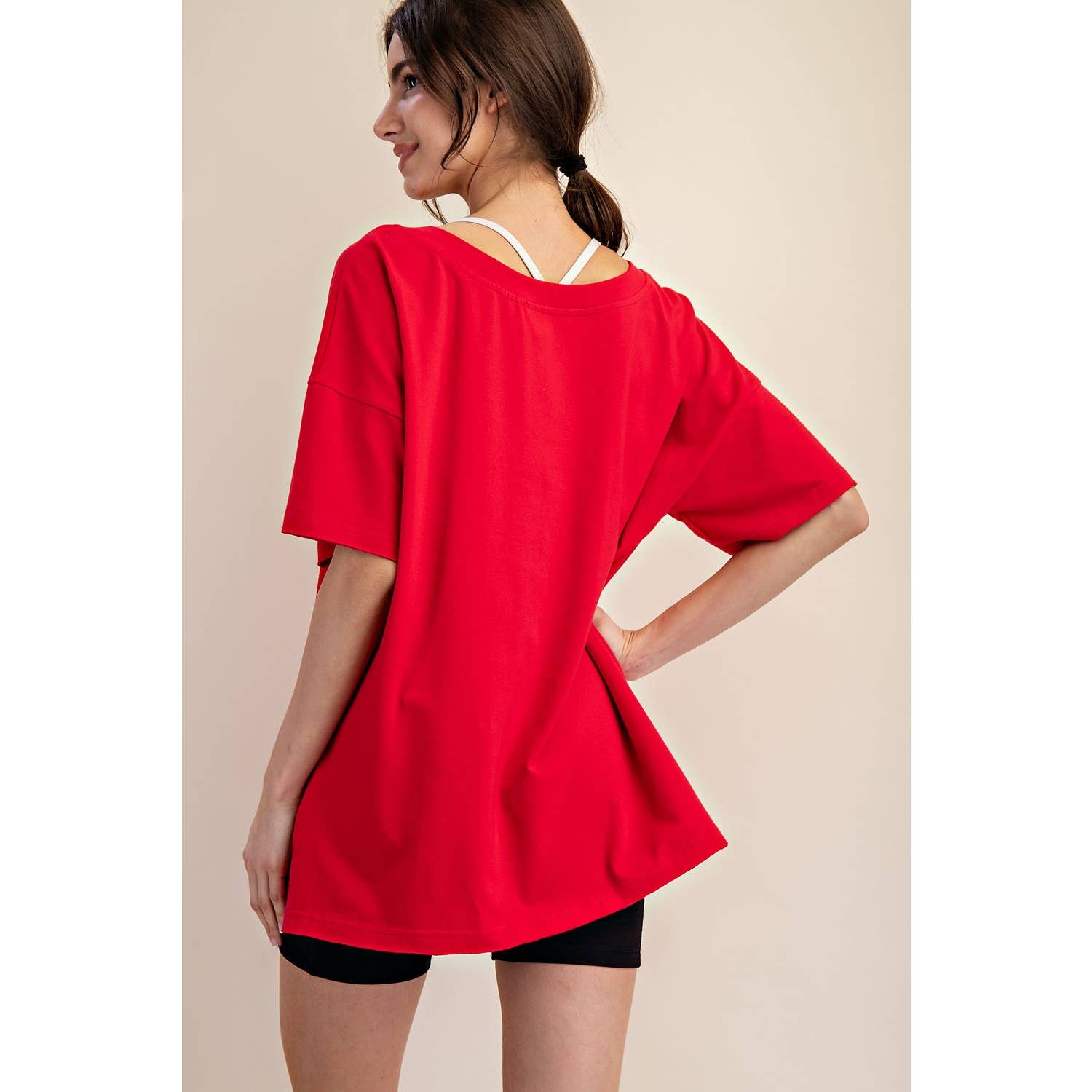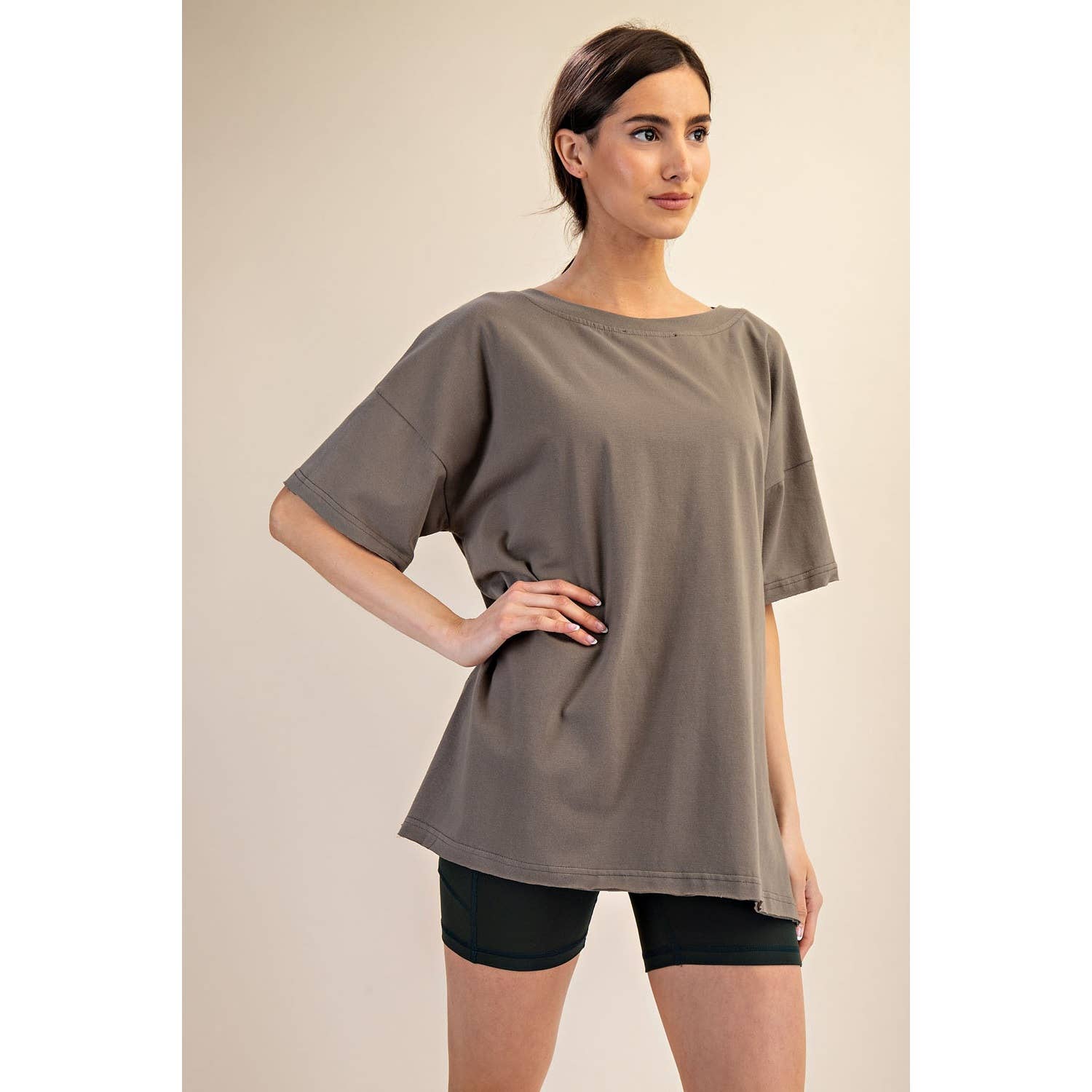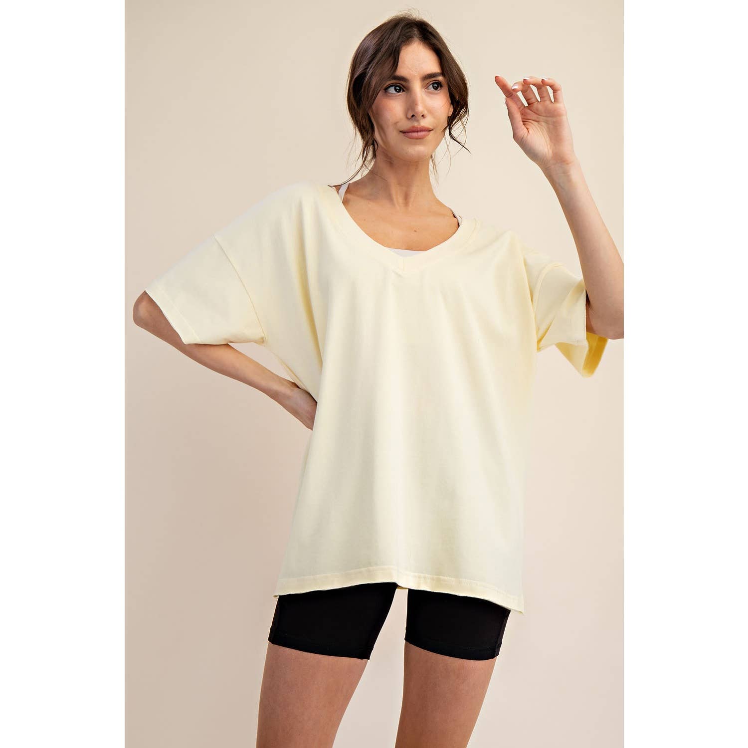 Elevate your wardrobe with this oversized short sleeve top. Designed with a reversible style for versatile wear, it offers a soft, stretchy fit and a relaxed silhouette perfect for effortless, everyday comfort. Features: - Cotton Lycra fabric - 4-way stretch - Relaxed fit / Oversized - Short sleeve - Dropped shoulder - V neck / Round neck - Side slit Model is 5'8" and wearing size Small. Fabric: 95% Cotton, 5% Spandex C.O.O: Domestic