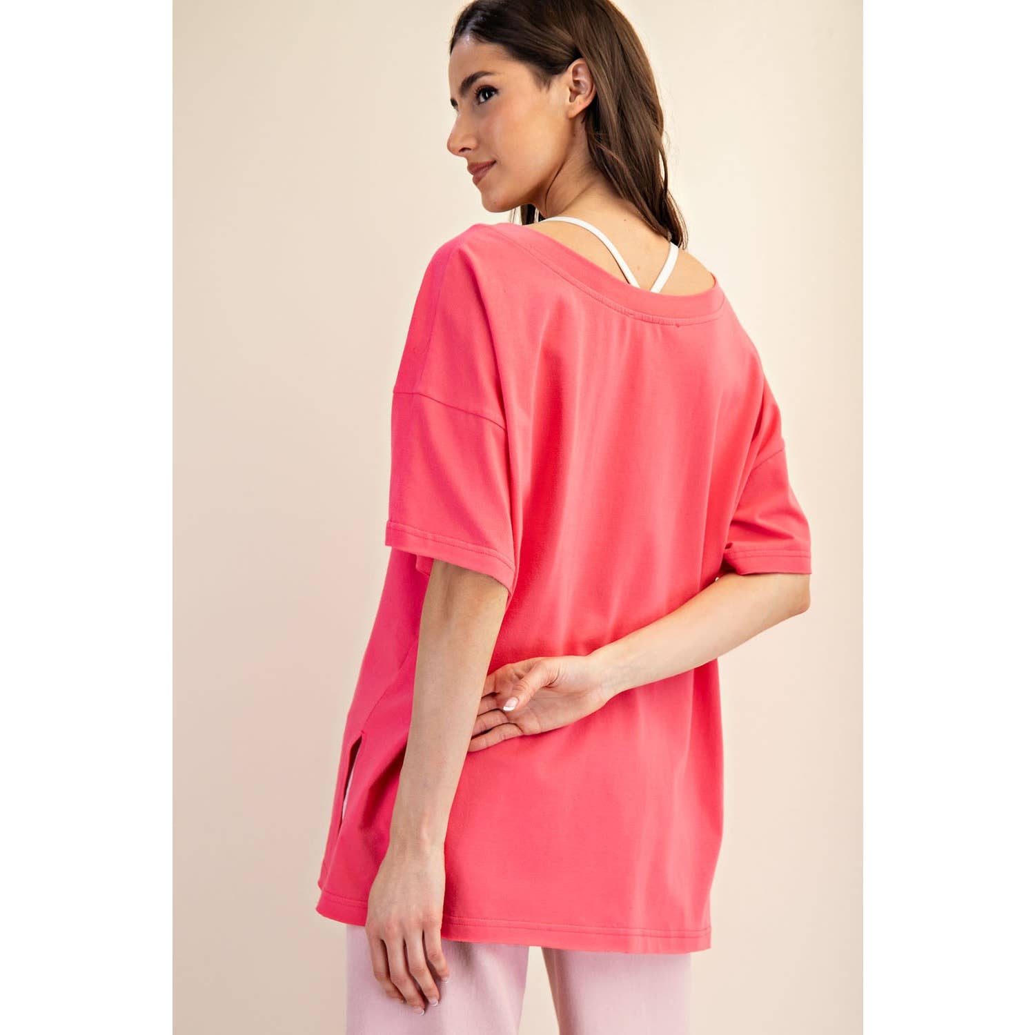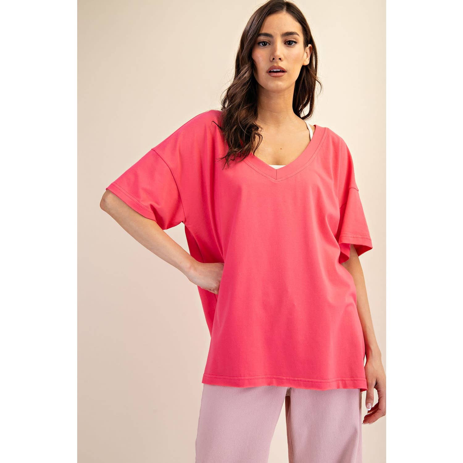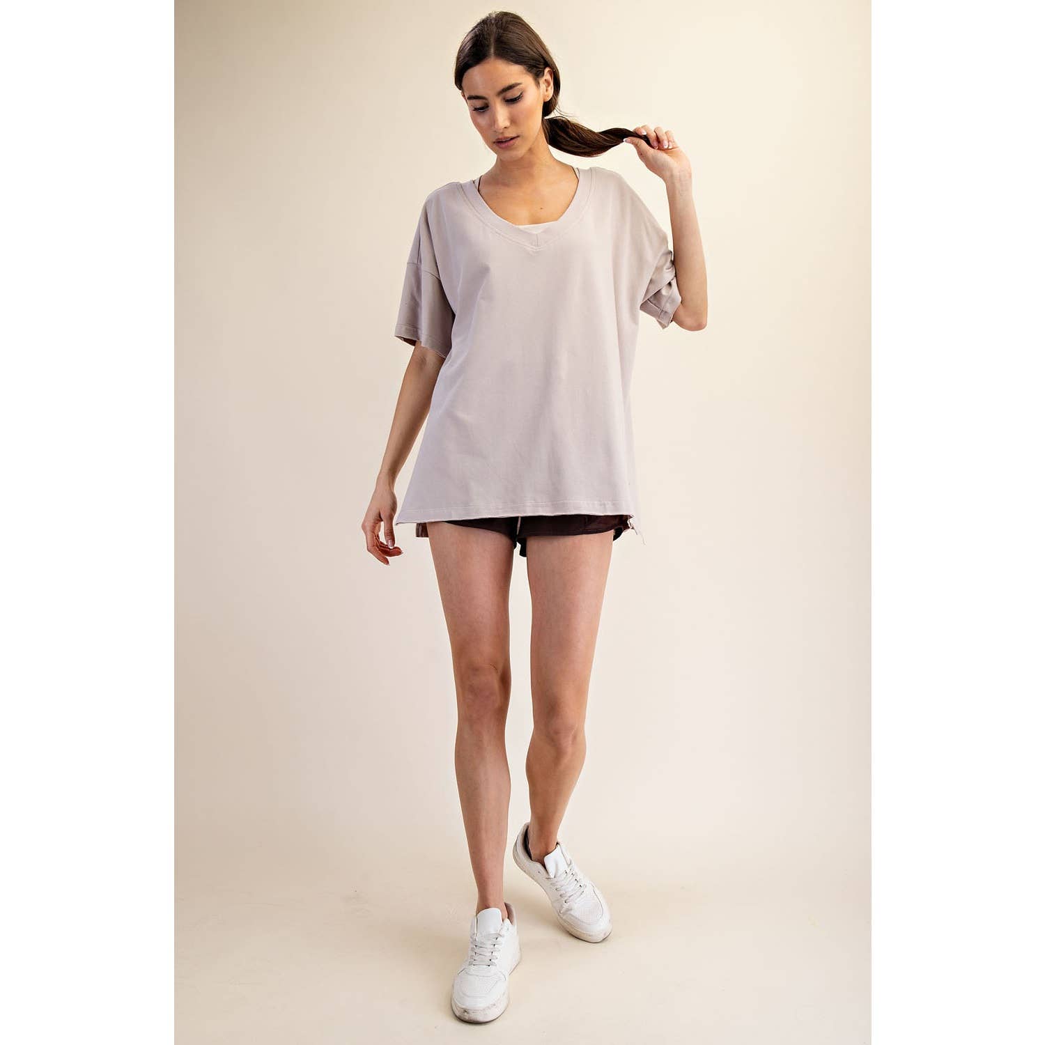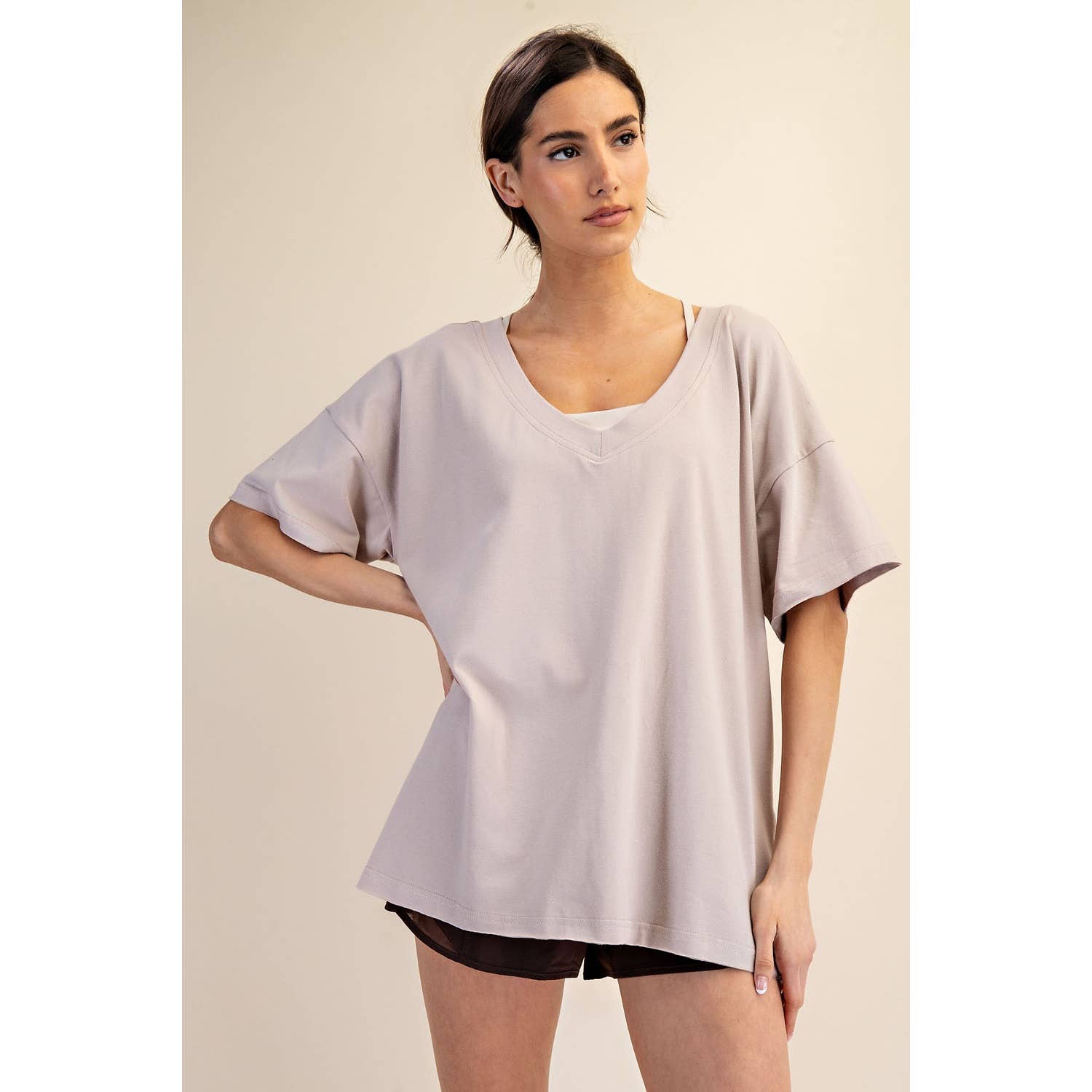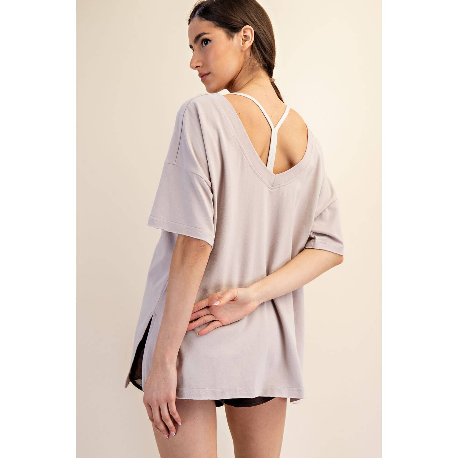 Elevate your wardrobe with this oversized short sleeve top. Designed with a reversible style for versatile wear, it offers a soft, stretchy fit and a relaxed silhouette perfect for effortless, everyday comfort. Features: - Cotton Lycra fabric - 4-way stretch - Relaxed fit / Oversized - Short sleeve - Dropped shoulder - V neck / Round neck - Side slit Model is 5'8" and wearing size Small. Fabric: 95% Cotton, 5% Spandex C.O.O: Domestic