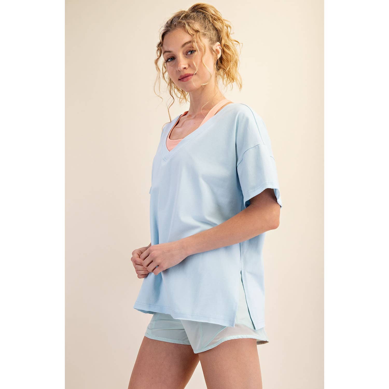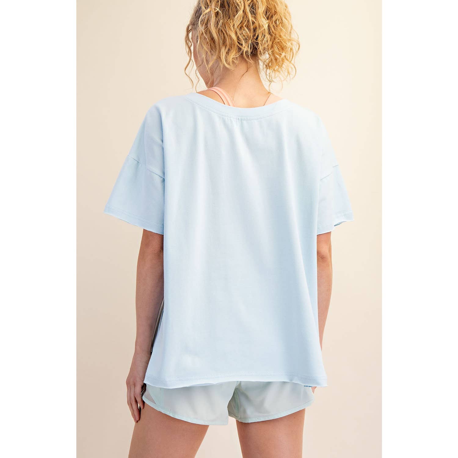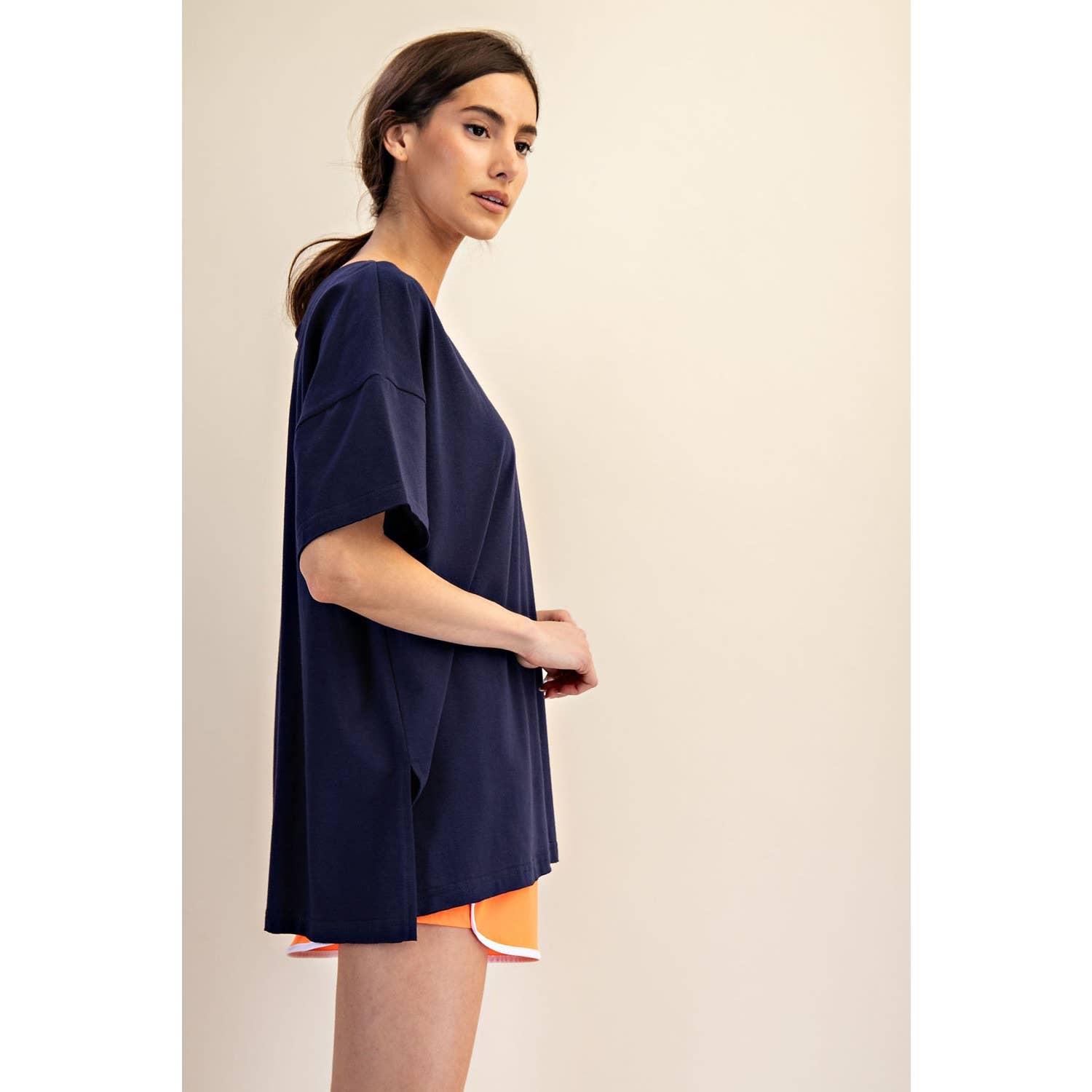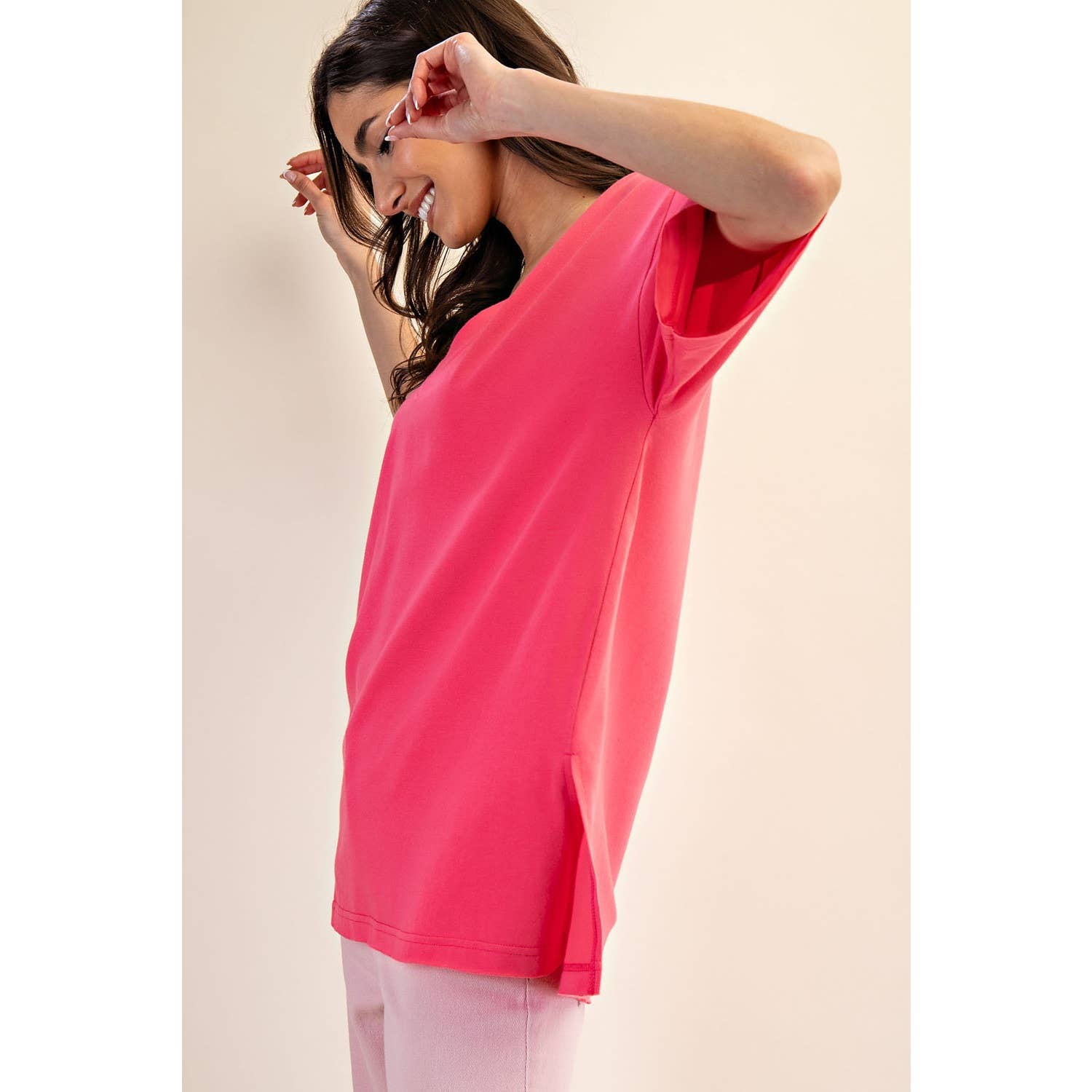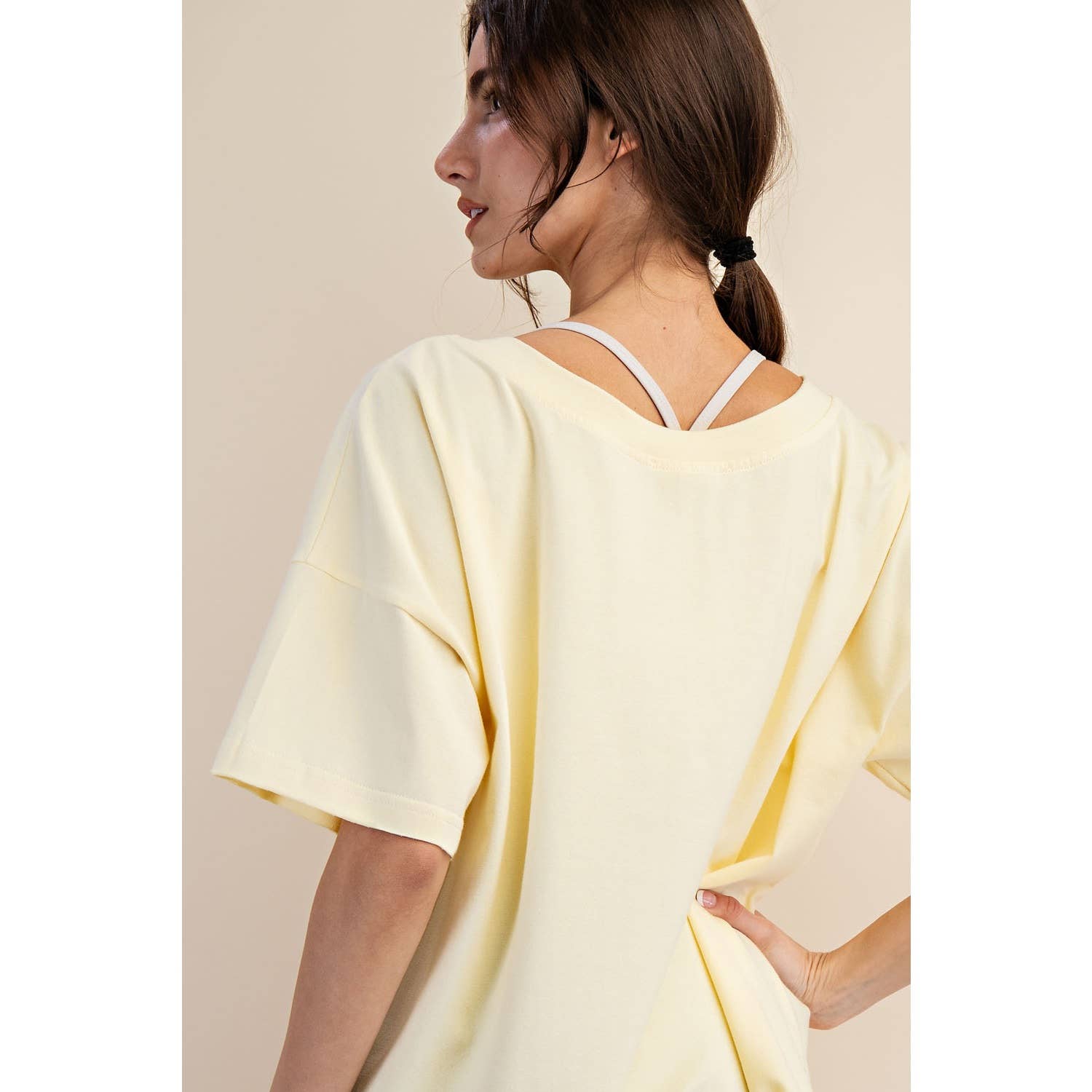 Elevate your wardrobe with this oversized short sleeve top. Designed with a reversible style for versatile wear, it offers a soft, stretchy fit and a relaxed silhouette perfect for effortless, everyday comfort. Features: - Cotton Lycra fabric - 4-way stretch - Relaxed fit / Oversized - Short sleeve - Dropped shoulder - V neck / Round neck - Side slit Model is 5'8" and wearing size Small. Fabric: 95% Cotton, 5% Spandex C.O.O: Domestic