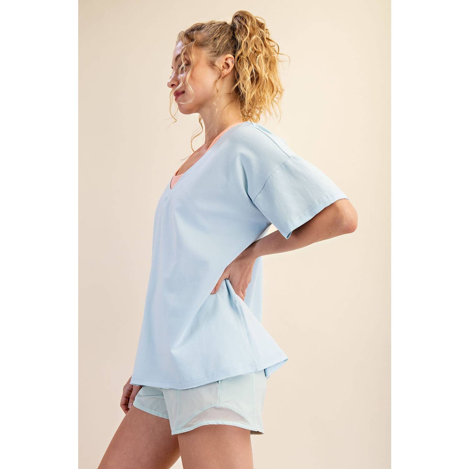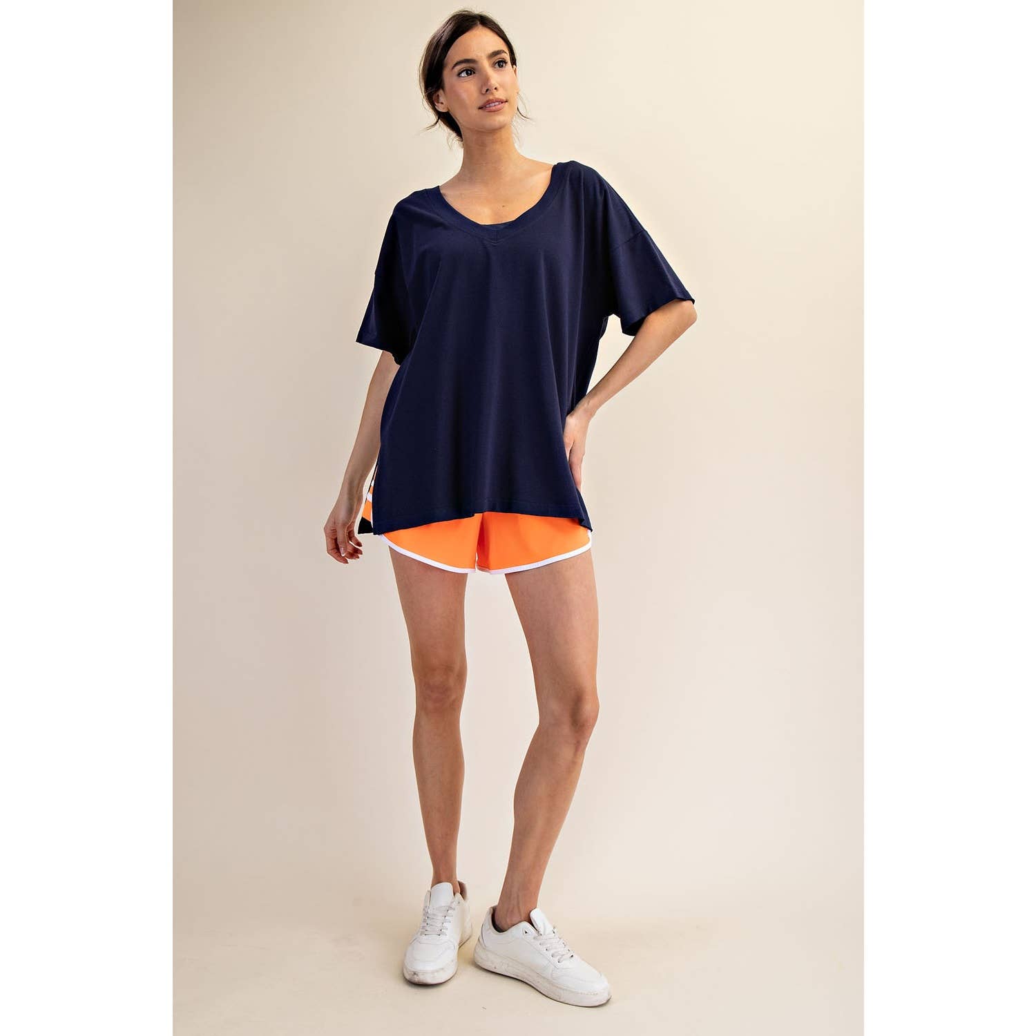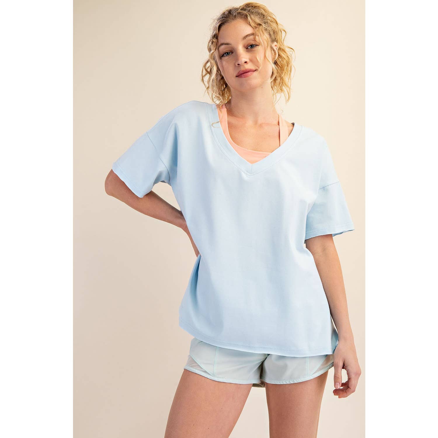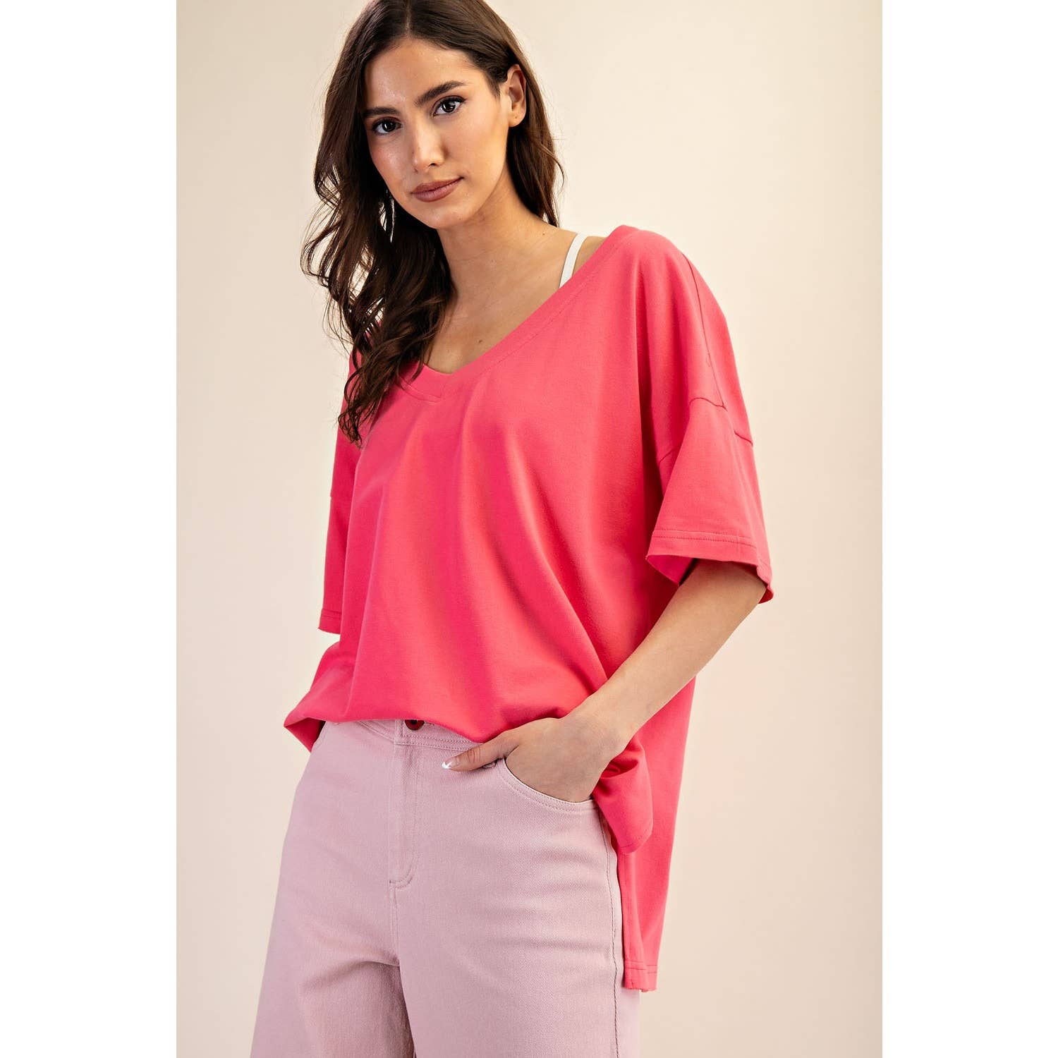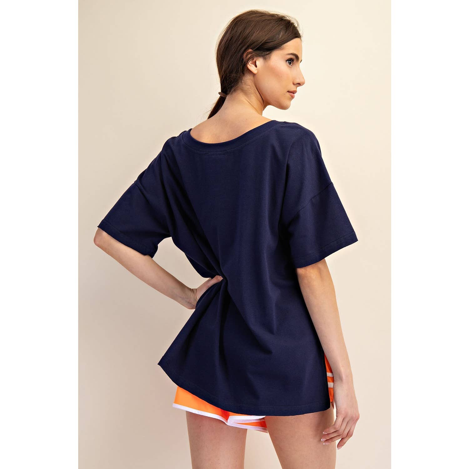 Elevate your wardrobe with this oversized short sleeve top. Designed with a reversible style for versatile wear, it offers a soft, stretchy fit and a relaxed silhouette perfect for effortless, everyday comfort. Features: - Cotton Lycra fabric - 4-way stretch - Relaxed fit / Oversized - Short sleeve - Dropped shoulder - V neck / Round neck - Side slit Model is 5'8" and wearing size Small. Fabric: 95% Cotton, 5% Spandex C.O.O: Domestic
