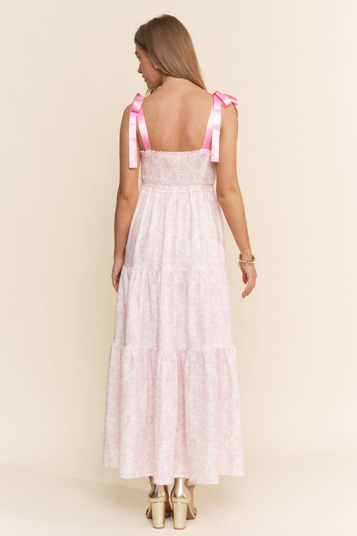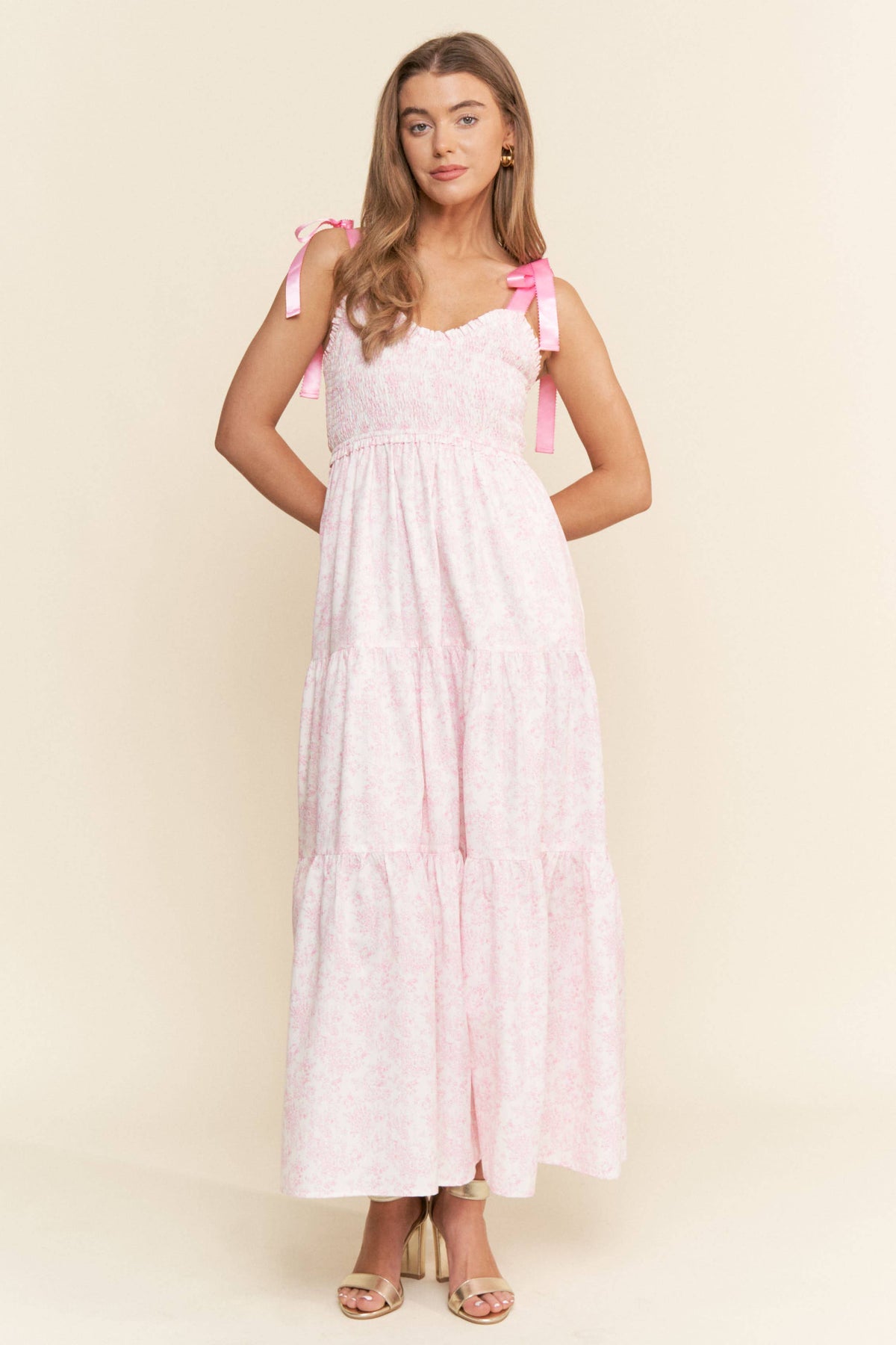 Women's empire neckline smocked floral print tiered maxi dress with pockets. Satin spaghetti straps. *POPULAR ITEM