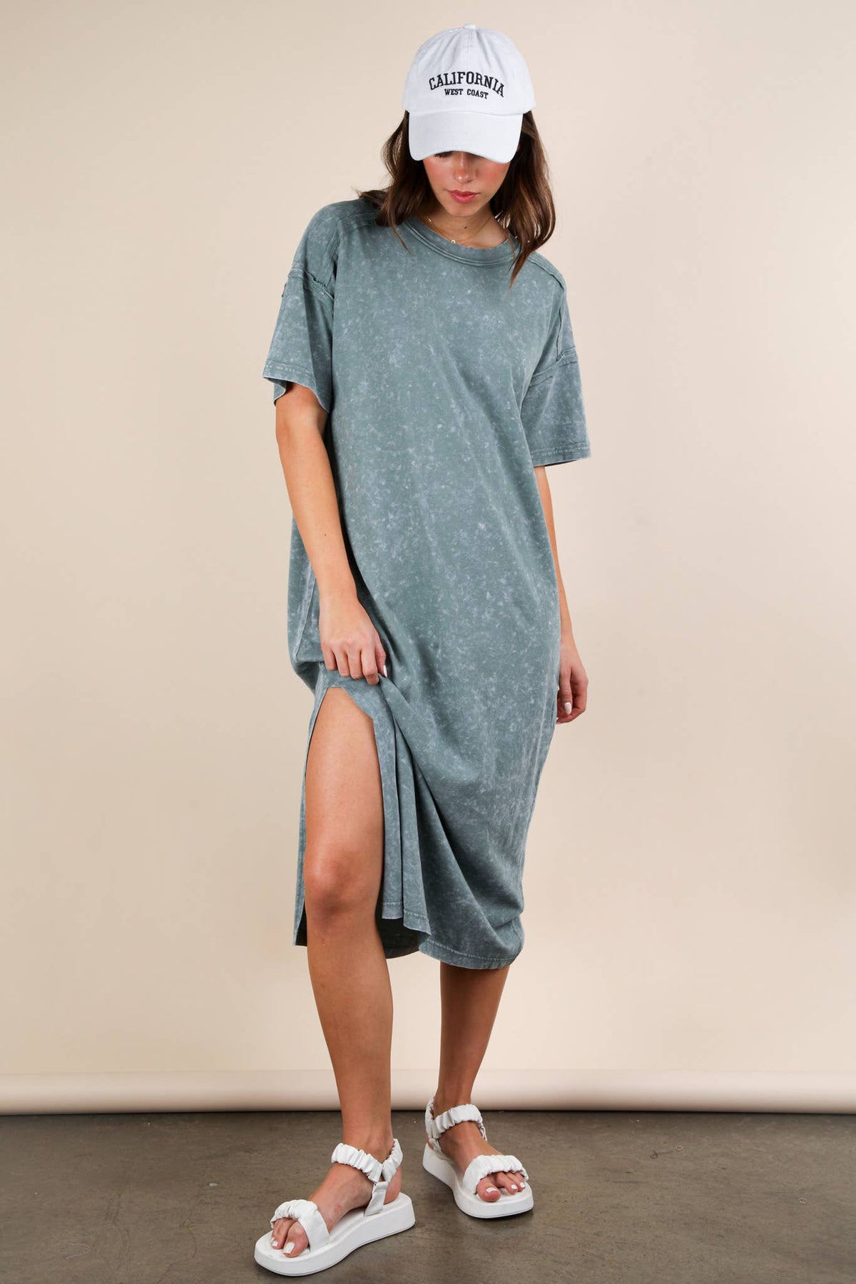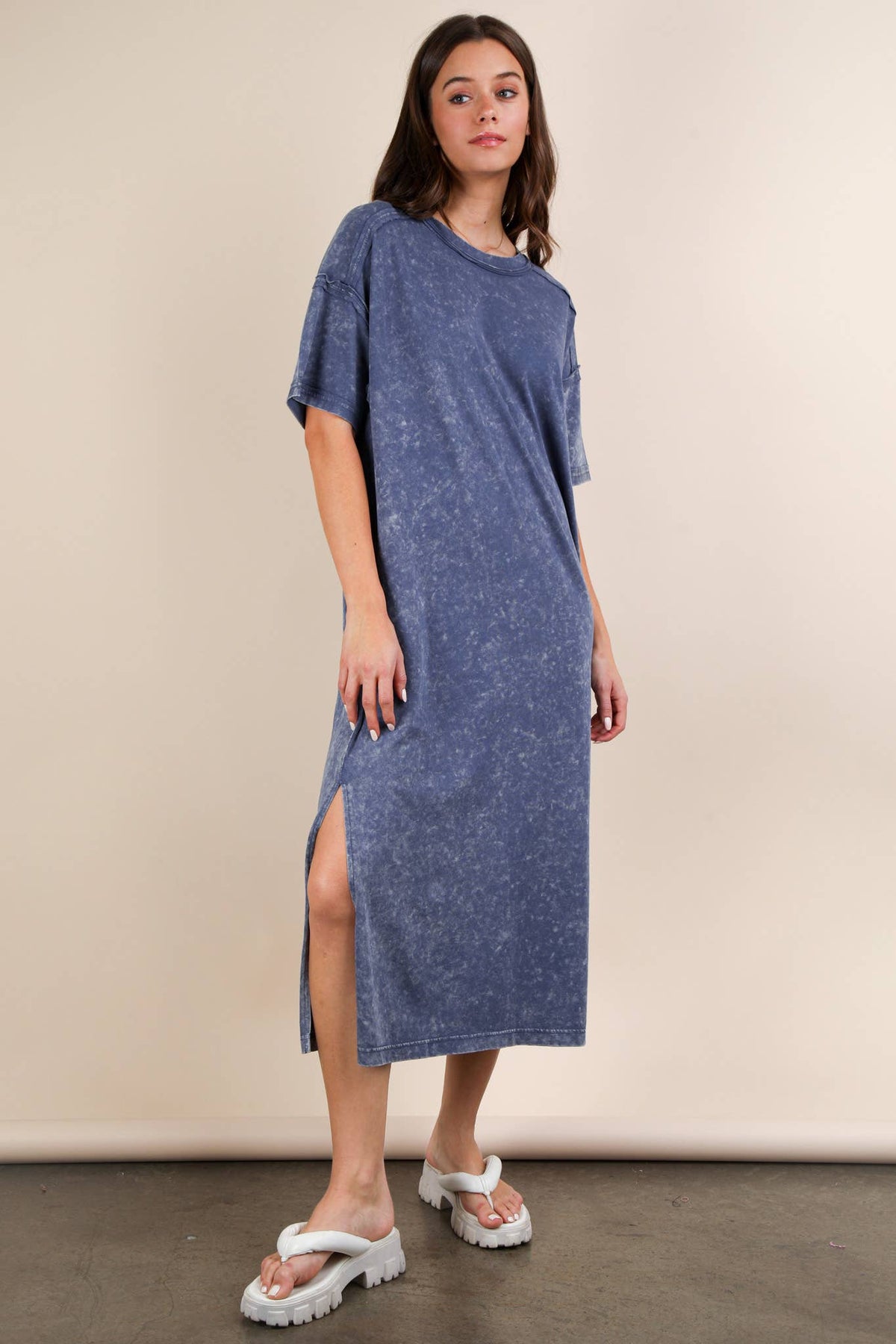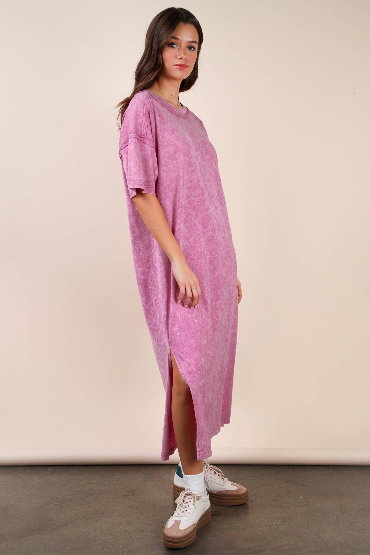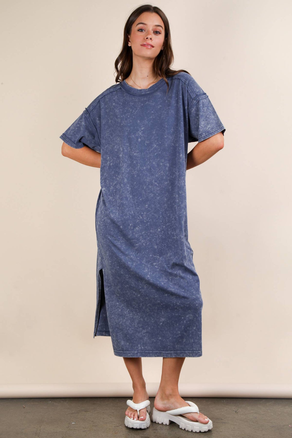 **PLUS SIZE Search for ND31601X** - Mineral Washed Casual Comfy Midi Dress - Oversized - Side Slit - Round Neck - Drop Shoulder - Short Sleeve - Raw Edge Detail - Loungewear - Back Pleat Detail (Model height: 5"8", wearing a Small, 2-2-2 Size Ratio, NEW IN)