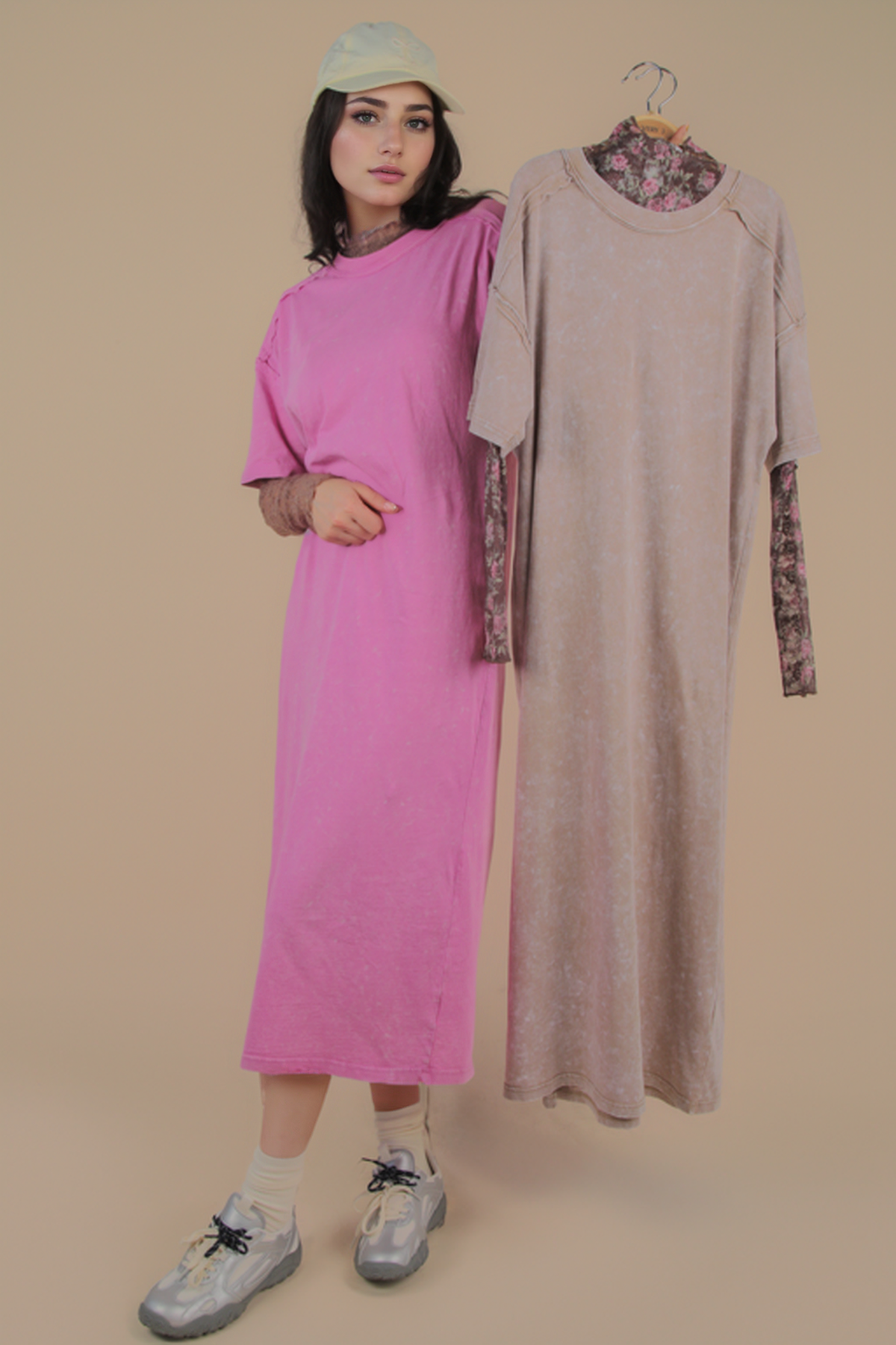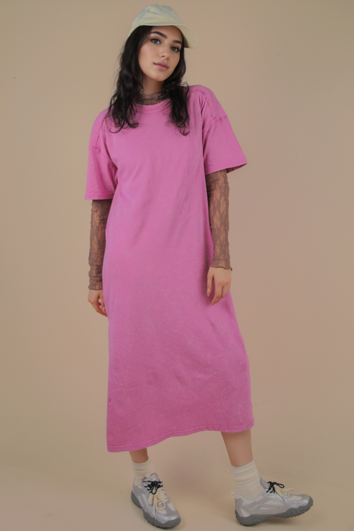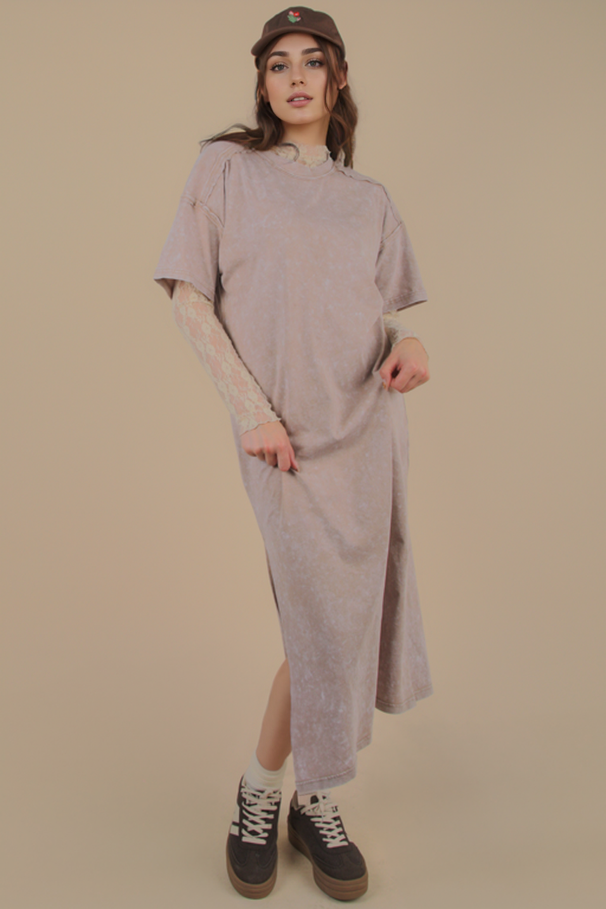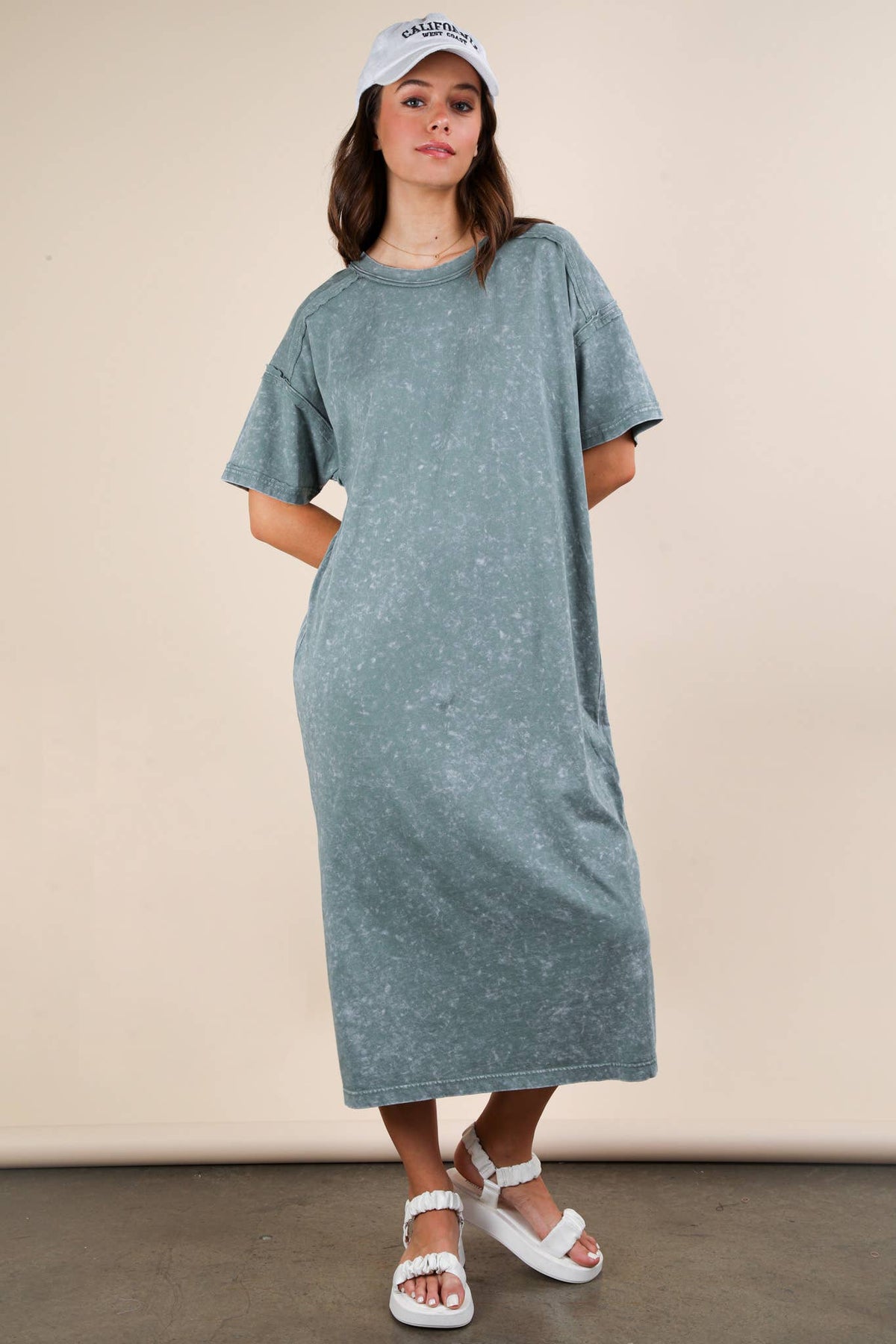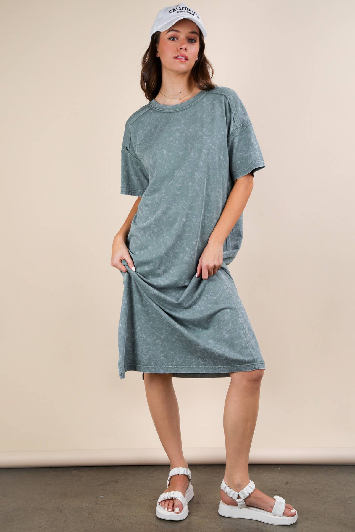 **PLUS SIZE Search for ND31601X** - Mineral Washed Casual Comfy Midi Dress - Oversized - Side Slit - Round Neck - Drop Shoulder - Short Sleeve - Raw Edge Detail - Loungewear - Back Pleat Detail (Model height: 5"8", wearing a Small, 2-2-2 Size Ratio, NEW IN)