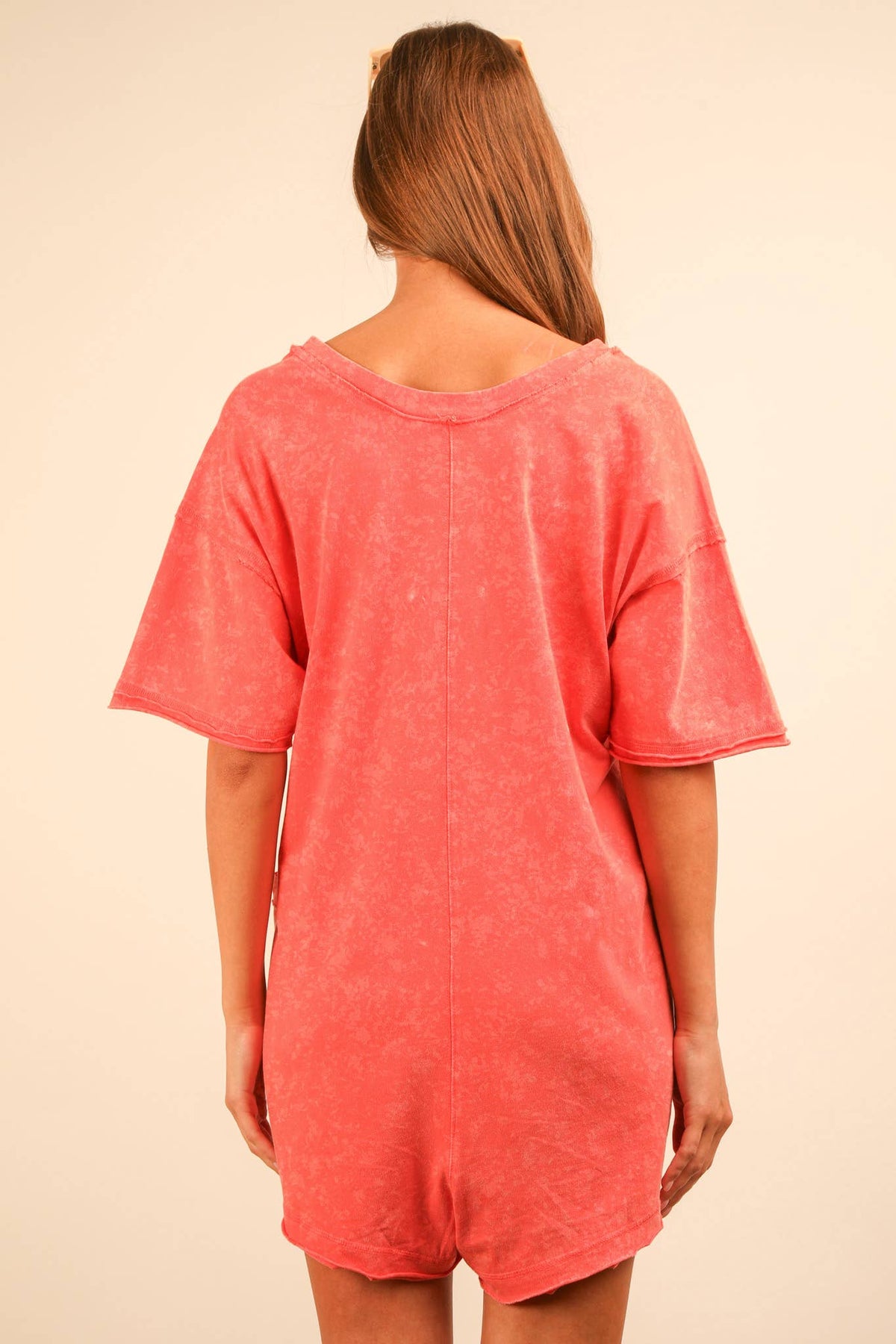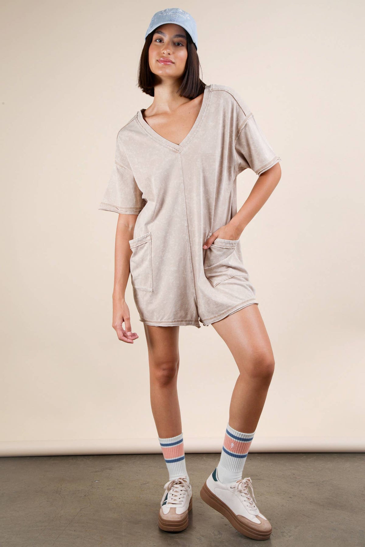 Mineral Washed Oversized Casual Knit Romper - Front Pockets - V-Neck - Drop Shoulder - Short Sleeve - Raw Edge Detail (Model height: 5"8", wearing a Small,