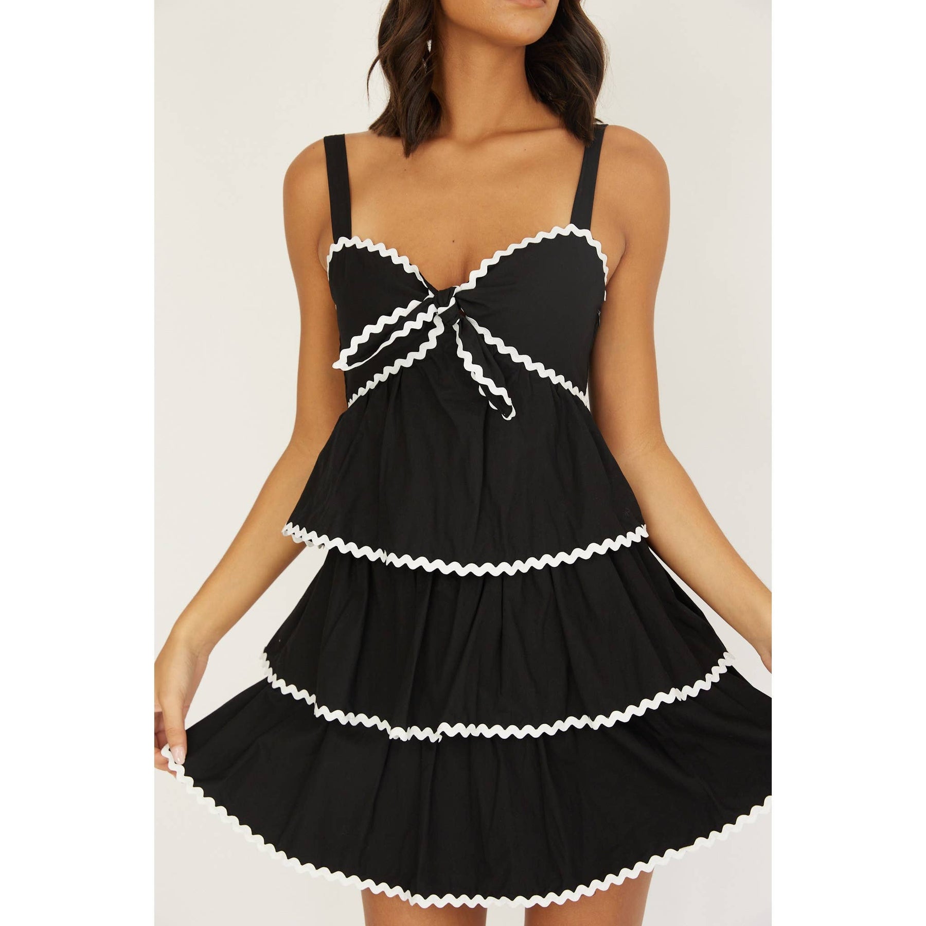 SLEEVELESS TIERED ZIGZAG DETAIL MINI DRESS FRONT TIE DETAIL 65%COTTON/35%POLYESTER
