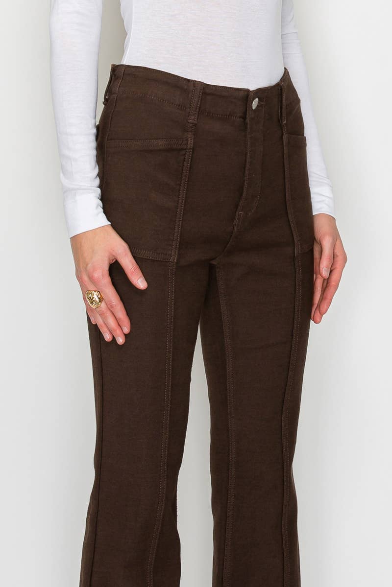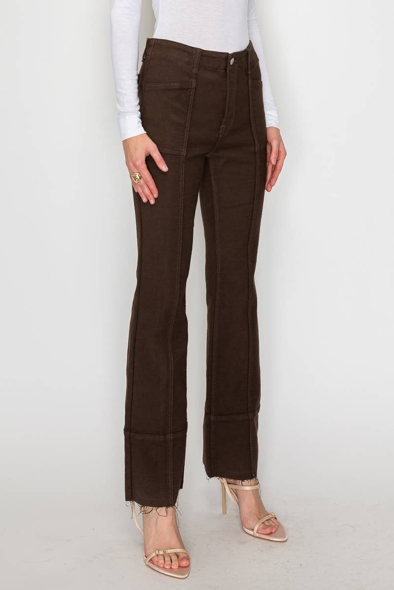 Elevate your wardrobe with our High Rise Bootcut Jeans, crafted in a rich brown wash that adds warmth and sophistication to any look. Designed with front patch pockets, vertical seam detailing, and a clean bootcut leg, this style offers a flattering, lengthened silhouette. The premium PFD-034 stretch fabric provides everyday comfort while maintaining a structured and polished fit. Finished with a modern raw hem, these jeans blend classic design with contemporary edge. Highlights : * High-rise waist for a sculpted, elongating fit * Tummy Control Hidden Waistband for a flattering, sculpted fit * Bootcut leg balances the silhouette and pairs effortlessly with heels or boots * Front patch pockets + vertical seam detailing enhance shape and add modern structure * Soft stretch denim delivers comfort, flexibility, and a smooth finish * Brown wash offers a fresh neutral alternative to classic denim * Raw hem detail adds subtle edge and trend-forward appeal Shape & fit : * High rise * Regular length