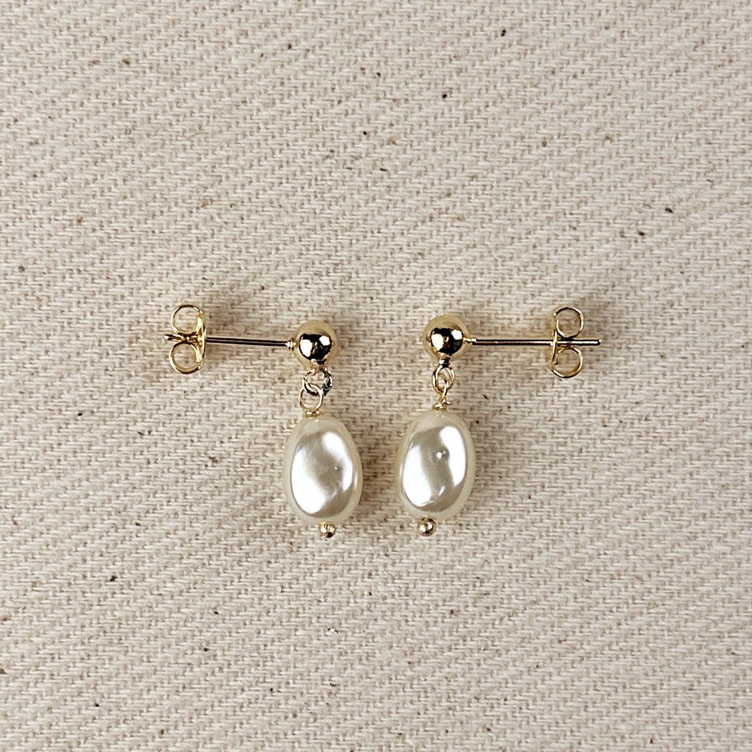 Enhance your style with these stunning 18k gold filled earrings featuring a ball stud post and a beautiful drop baroque pearl. Add elegance to any outfit and make a statement with these unique earrings. Elevate your accessory game today! * Metal: 18k Gold-filled 1/20 * 10mm Simulated Baroque Pearl * 15mm long * Hypoallergenic *