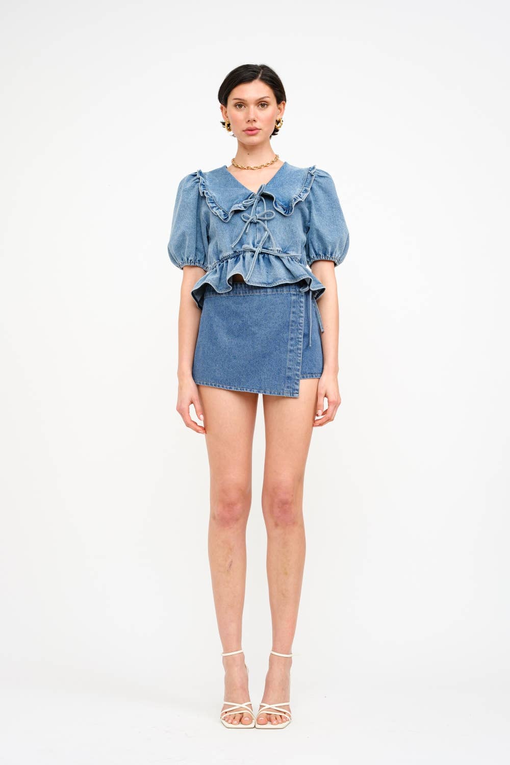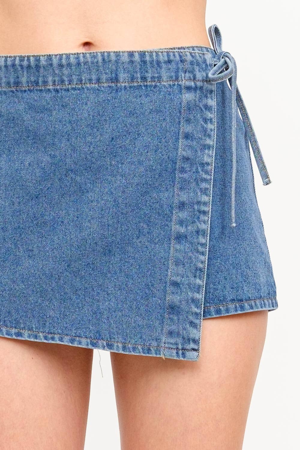 DENIM MINI WRAP SKORT - Hand wash cold - Do not bleach - Line dry - Iron low if needed - Do not tumble dry Model is 5'11" and is wearing a size small