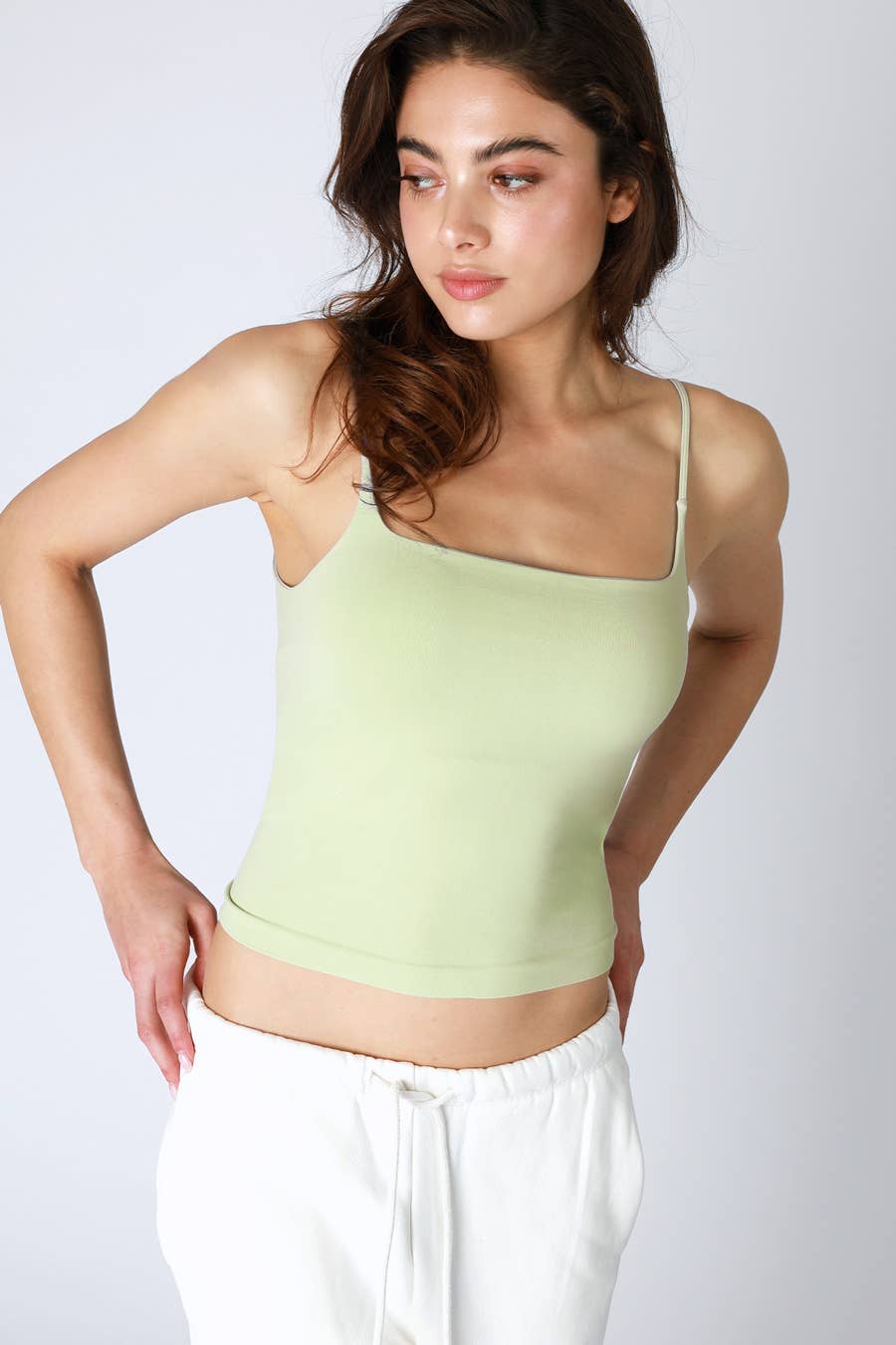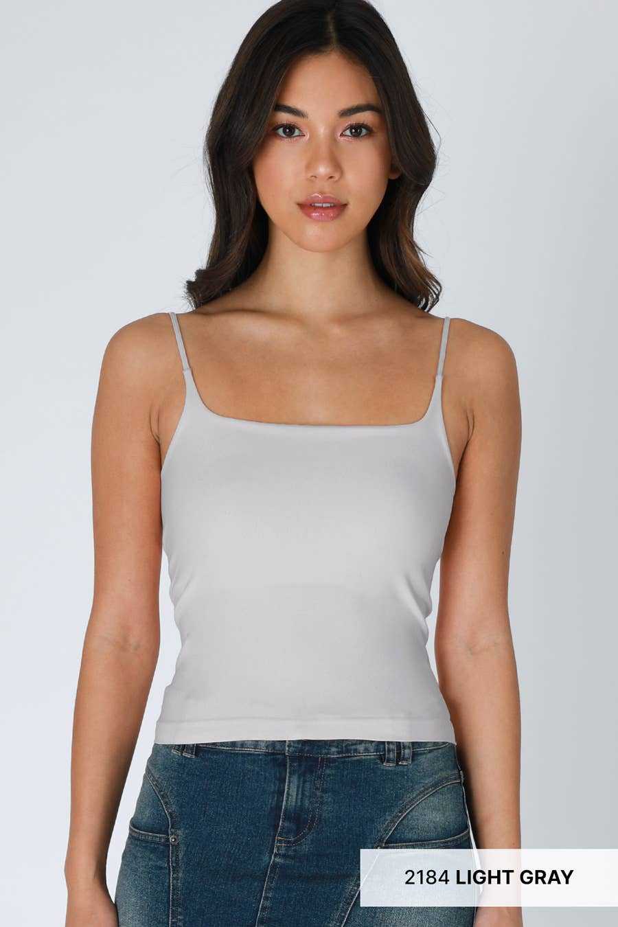 Elevate your basics with this sleek seamless square neck top. Designed with spaghetti straps, this top offers a clean and minimalistic look, perfect for layering or wearing solo for a fresh, modern style.
