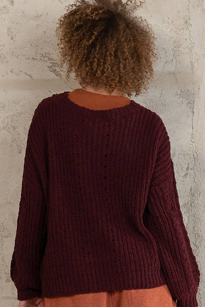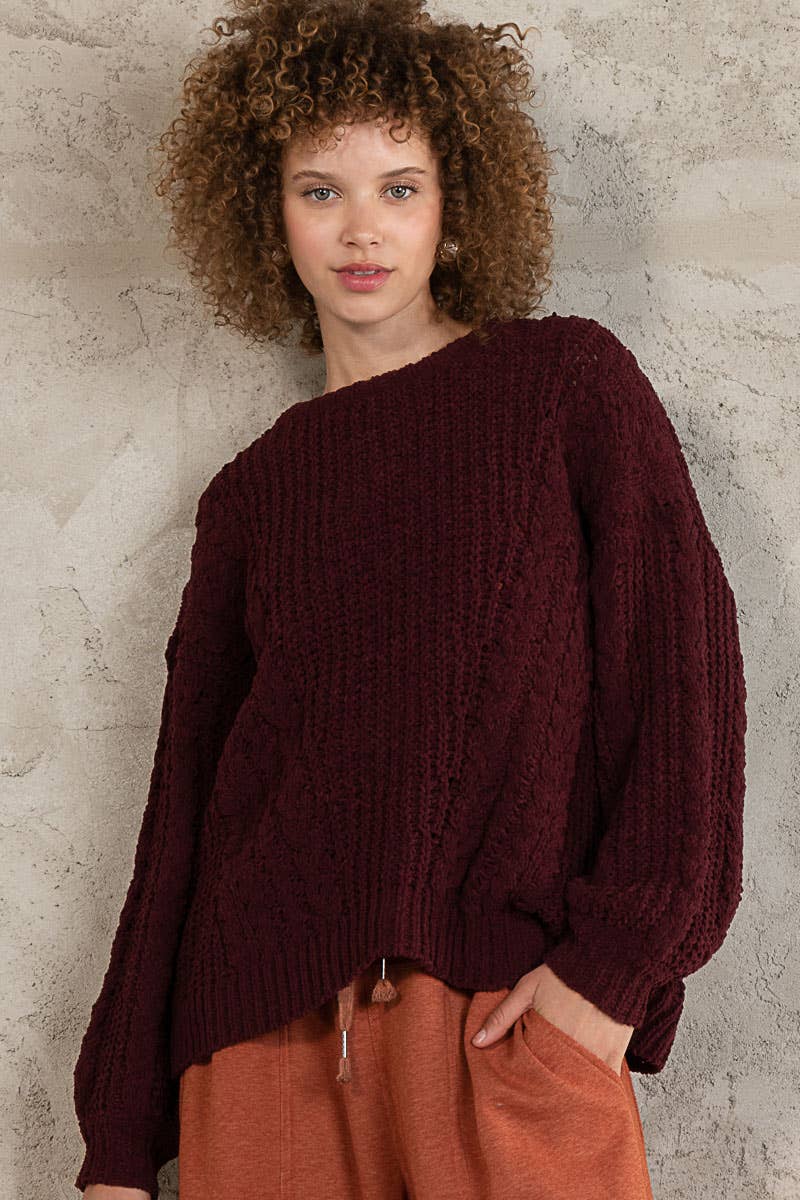 Designed in round neckline roomy fit sweater, long sleeve, fun shape weaving, featured in chenille sweater Specs/Dimensions: - LENGTH:23" - BUST:25 1/2"