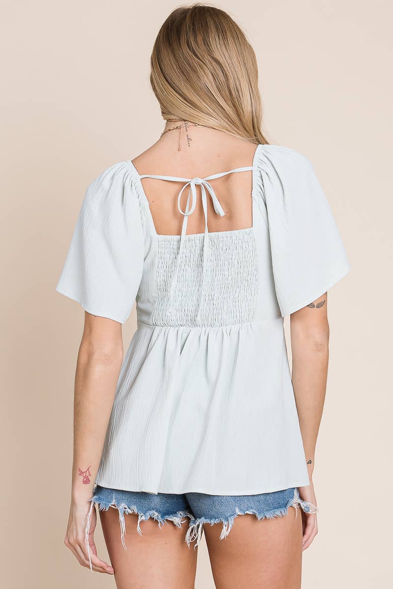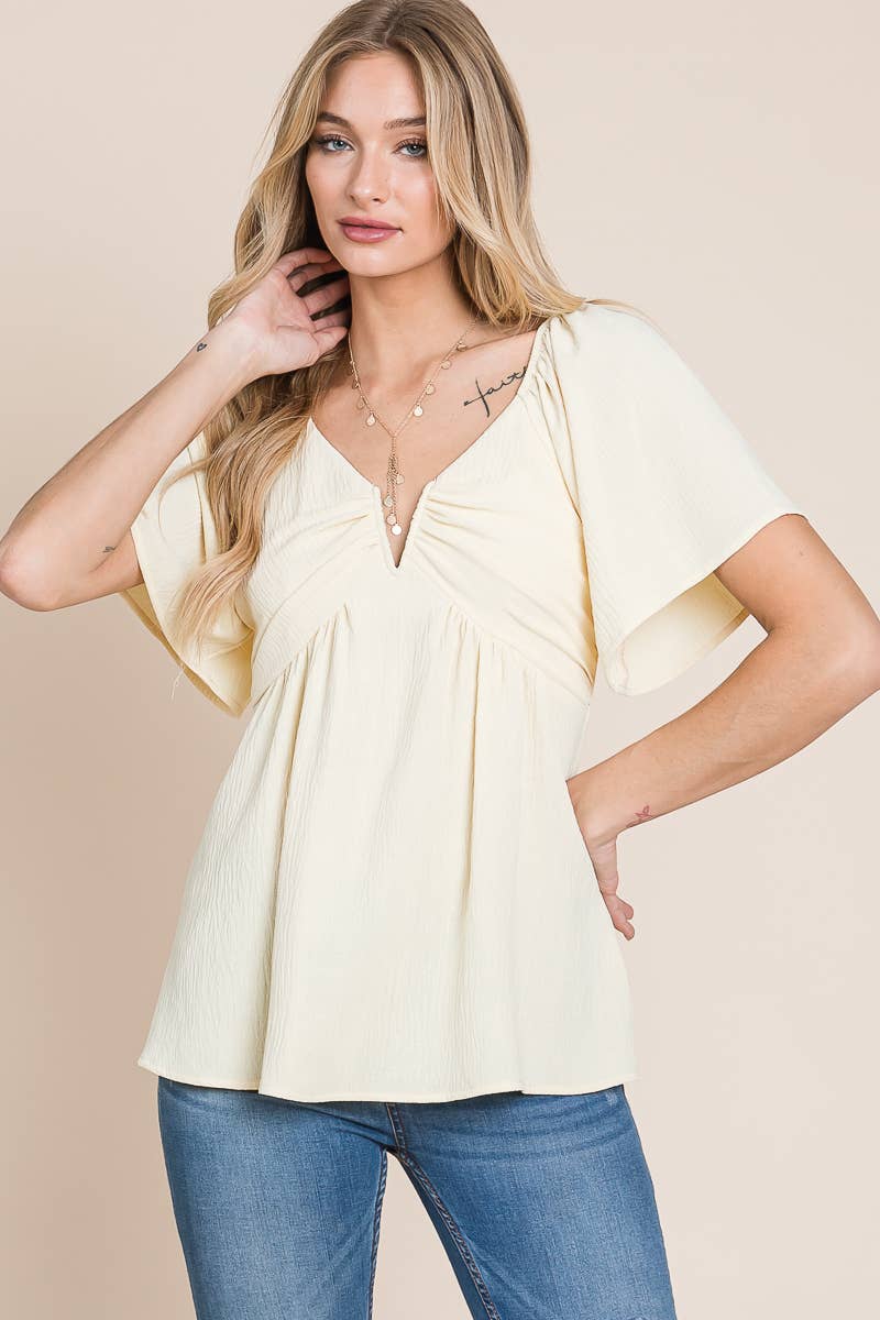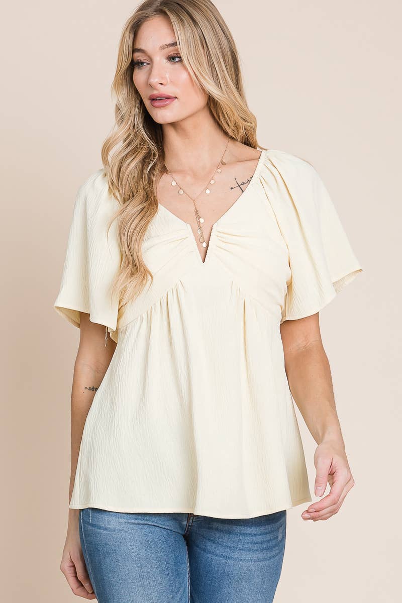Add a touch of bohemian charm to your wardrobe with our split-neck crinkled blouse. Made from a lightweight and crinkled fabric, this blouse is perfect for warm weather and gives off a laid-back, carefree vibe. The split neck and smocked back with tie detail add a touch of whimsy, while the flare sleeves give a feminine touch.