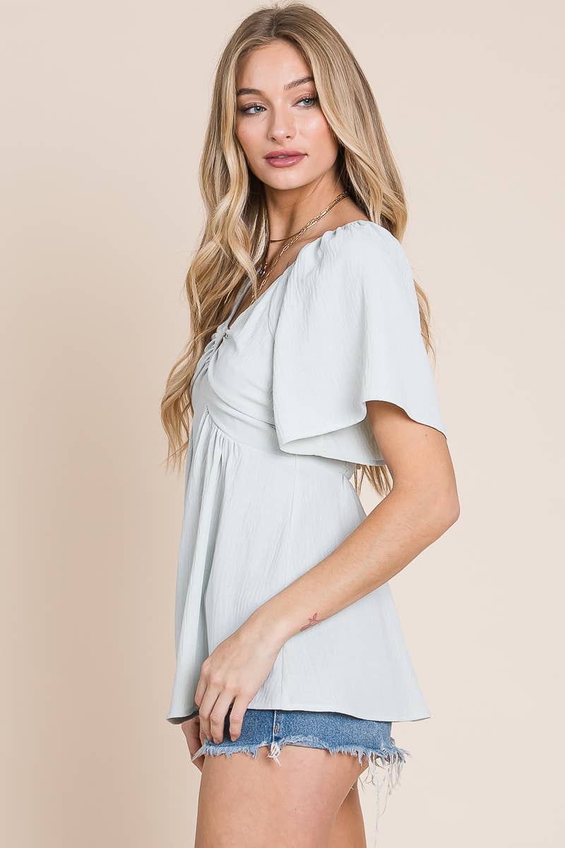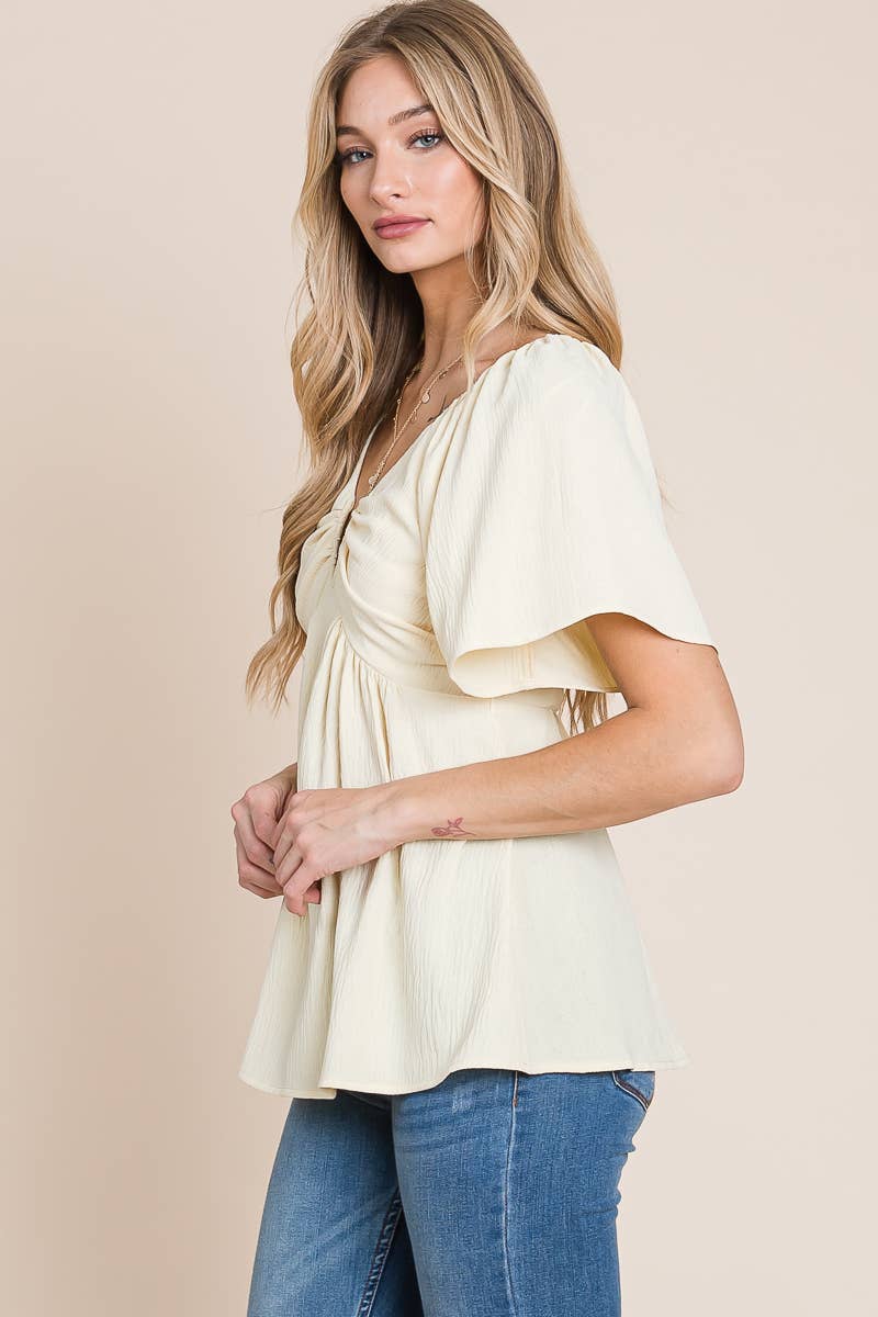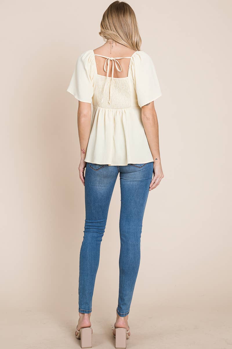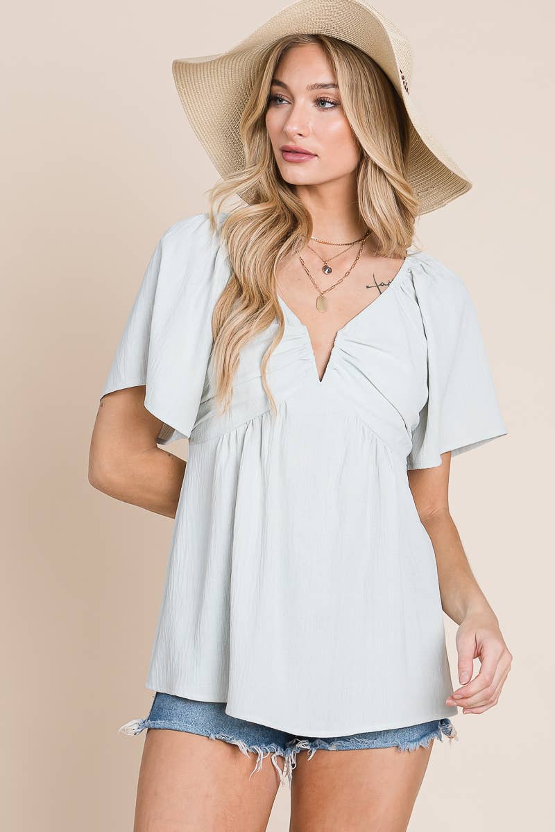 Add a touch of bohemian charm to your wardrobe with our split-neck crinkled blouse. Made from a lightweight and crinkled fabric, this blouse is perfect for warm weather and gives off a laid-back, carefree vibe. The split neck and smocked back with tie detail add a touch of whimsy, while the flare sleeves give a feminine touch.