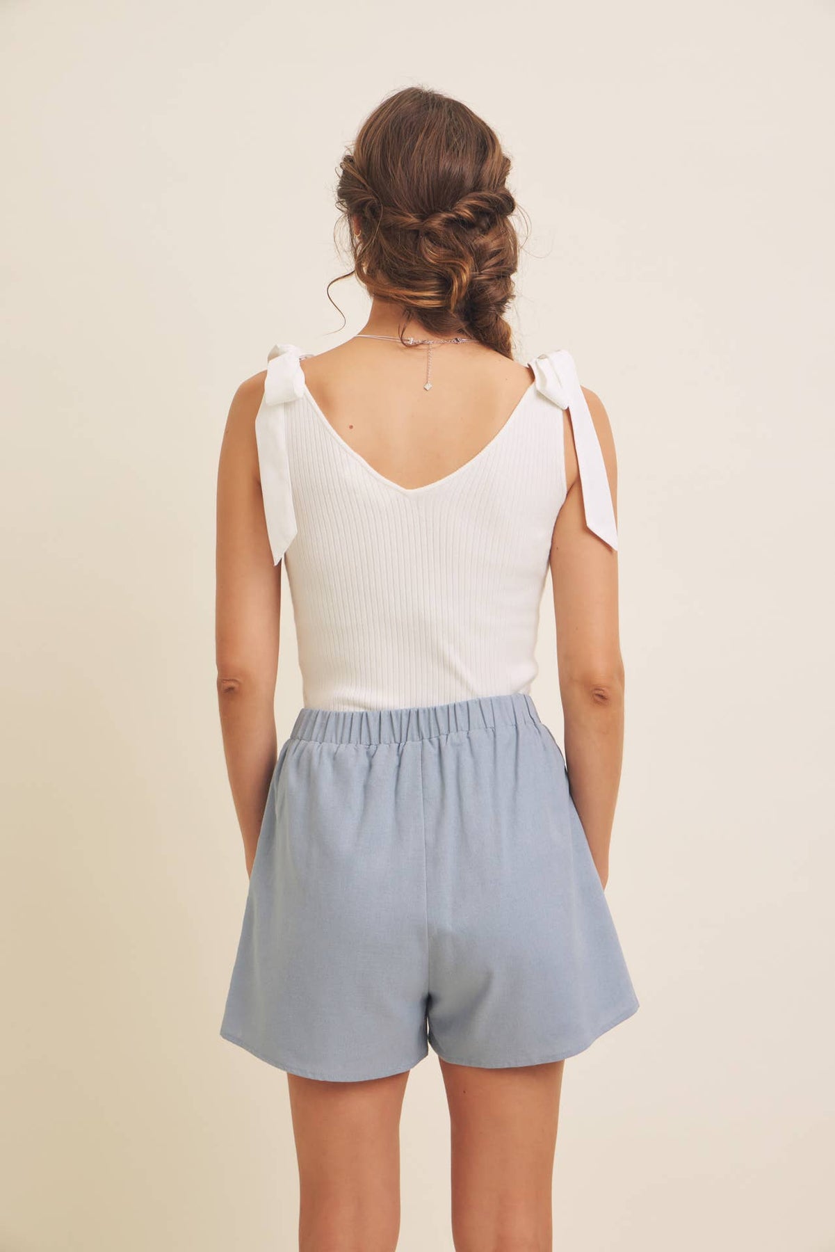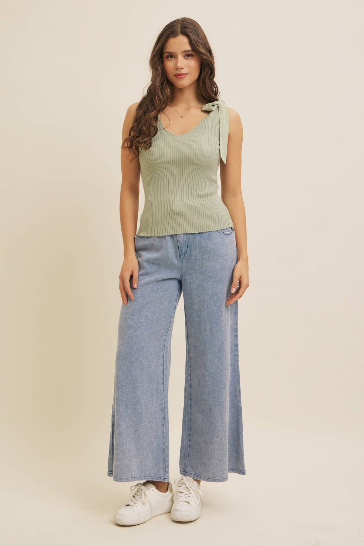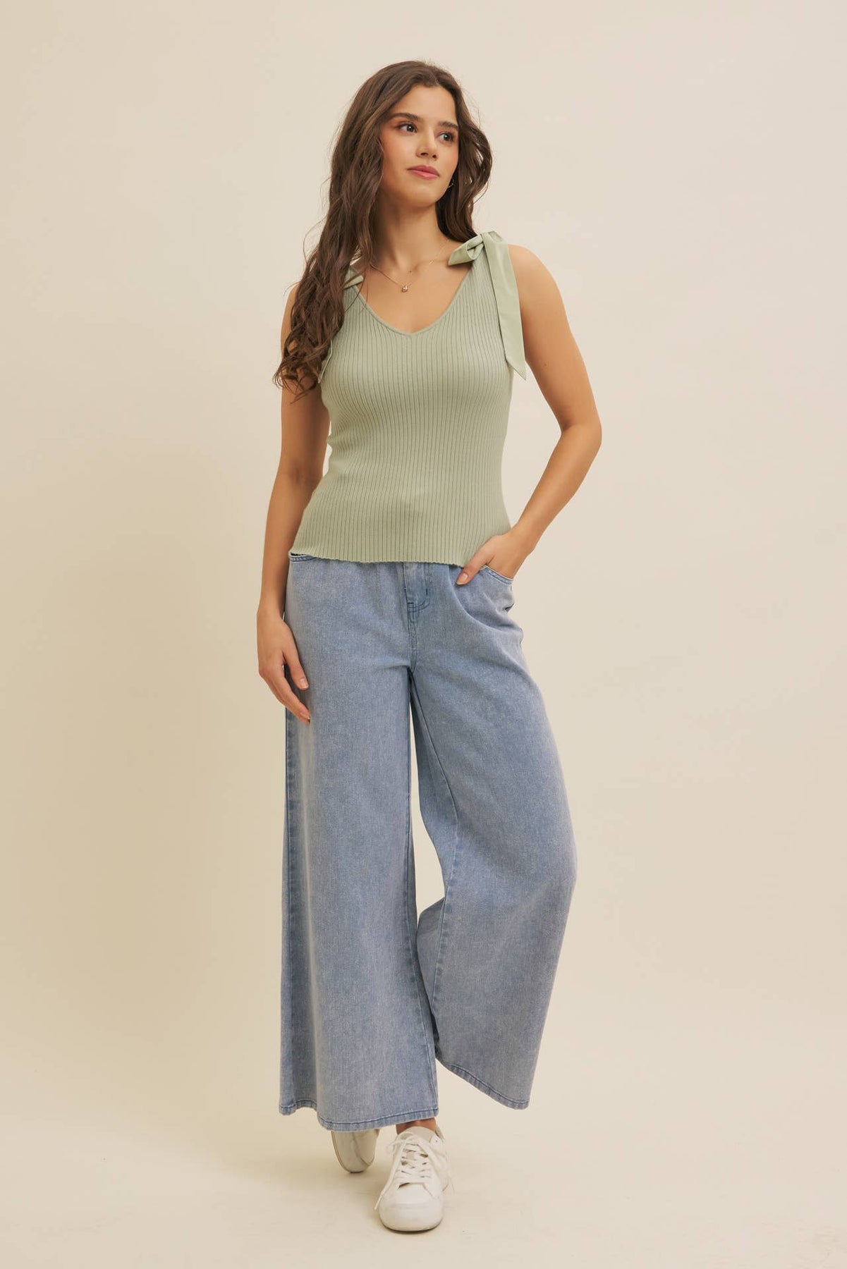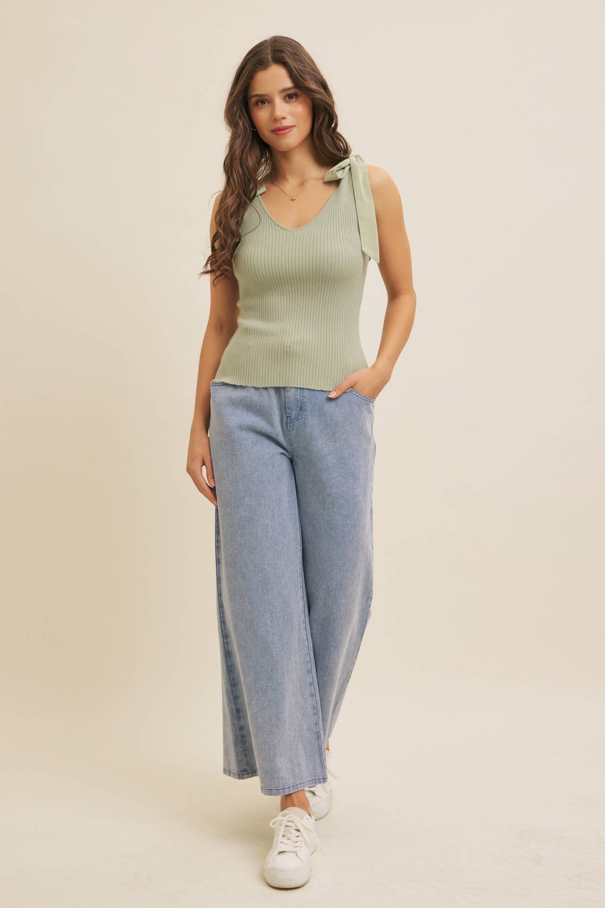 MIXED MEDIA SHOULDER TIE STRETCHY RIB SWEATER TOP
