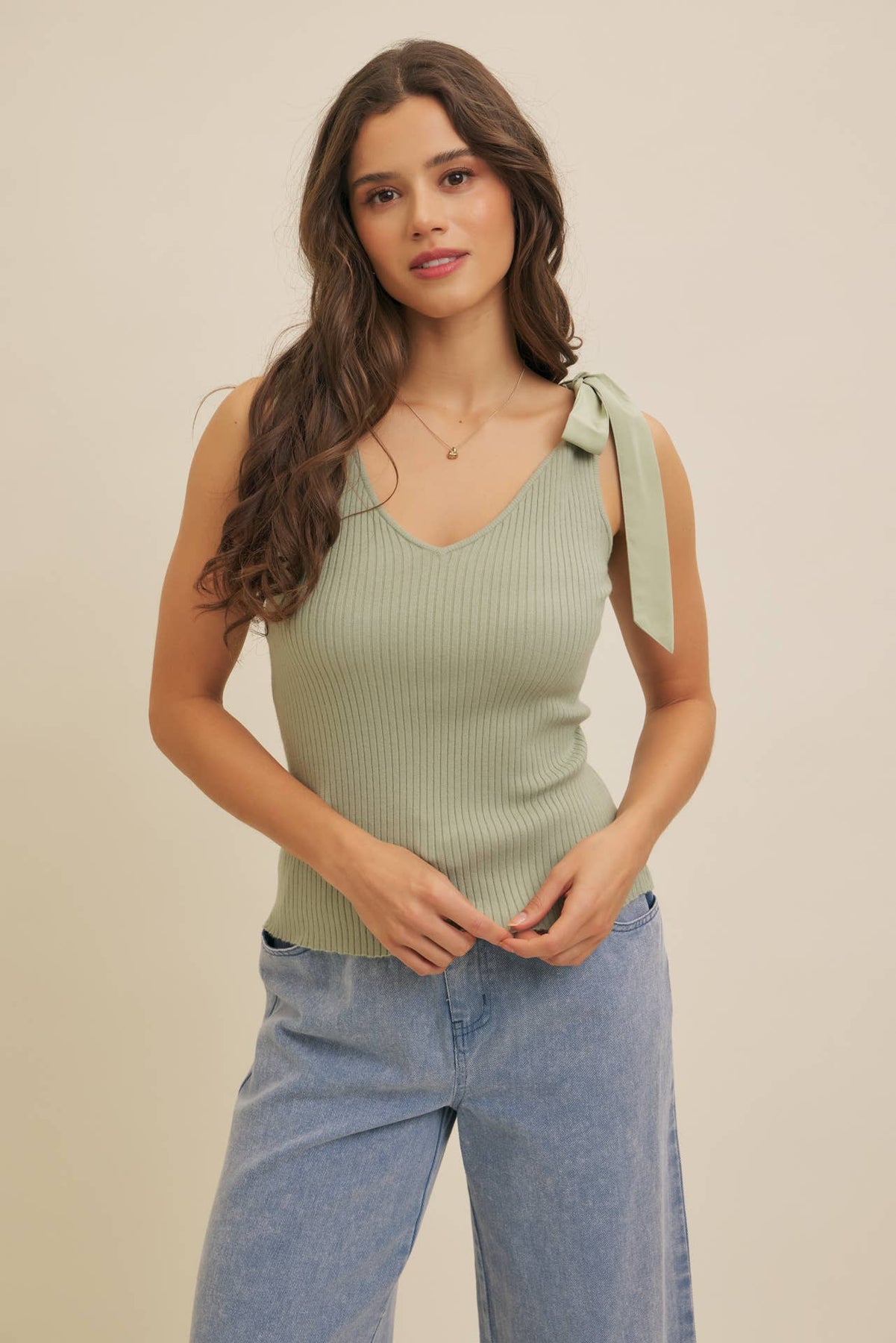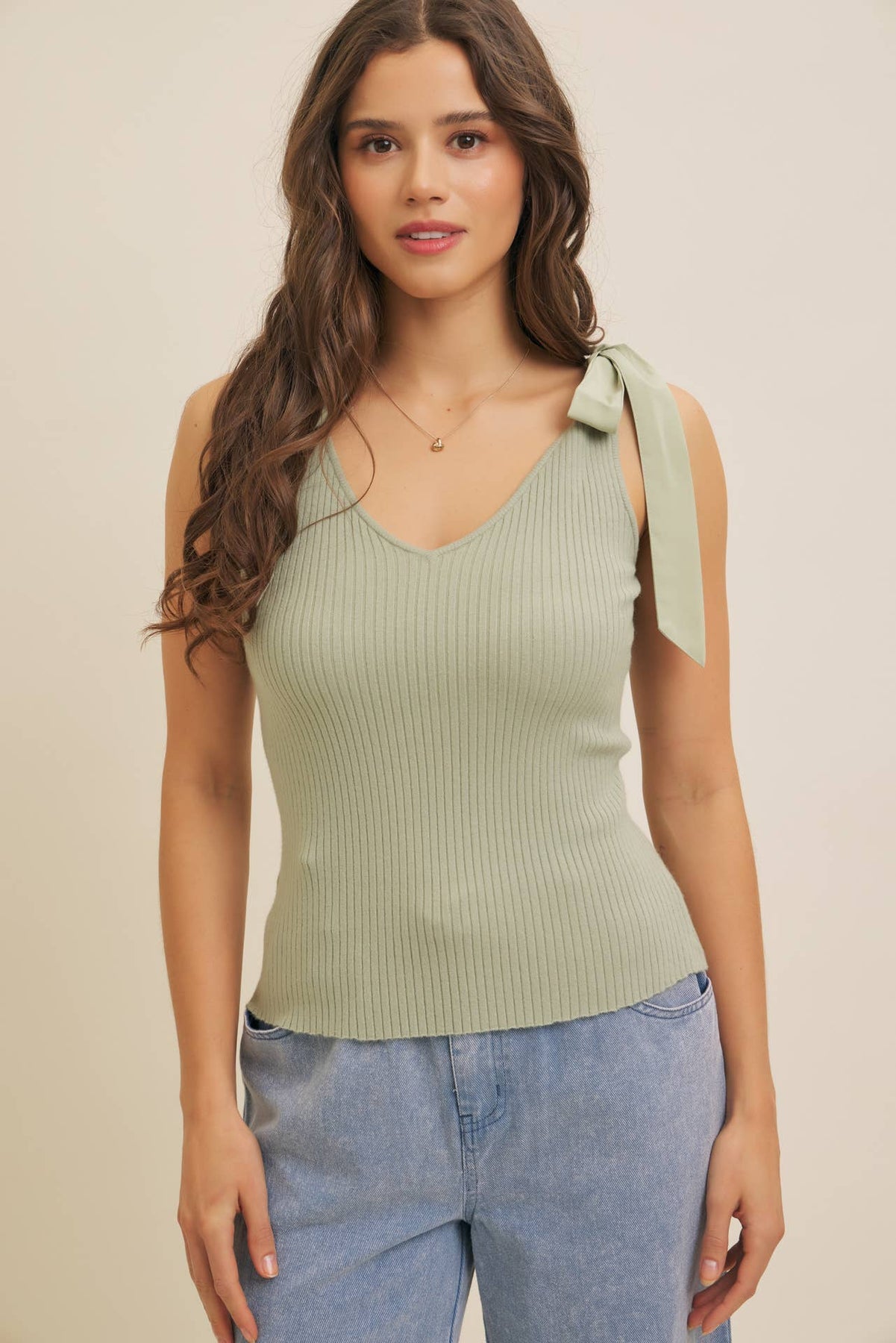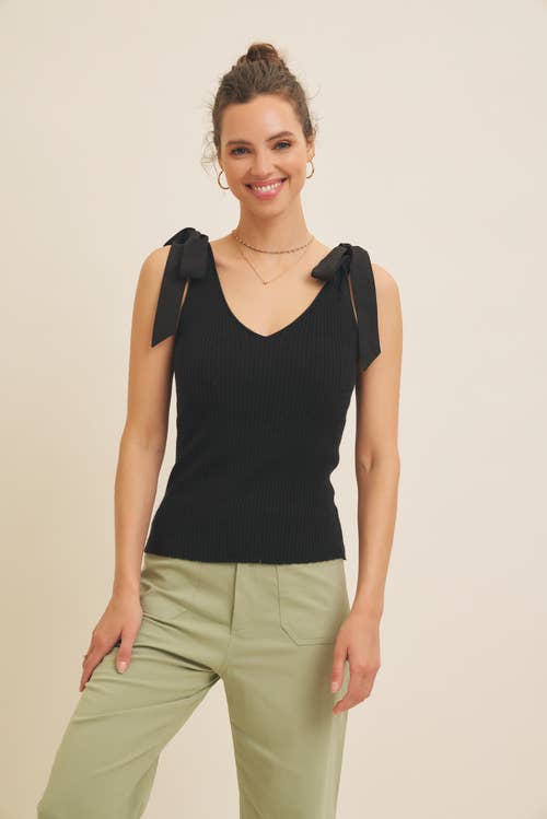 * Style No.: A2042SW Features - Mixed media - Shoulder ribbon tie - Stretchy rib sweater fabric - V-neckline Contents - SELF: 51% VISCOSE 28% POLYESTER 21% NYLON - CONTRAST: 100% POLYESTER Size + Fit Model is 5'9.5" and wearing a size Small. Please refer to our size chart.