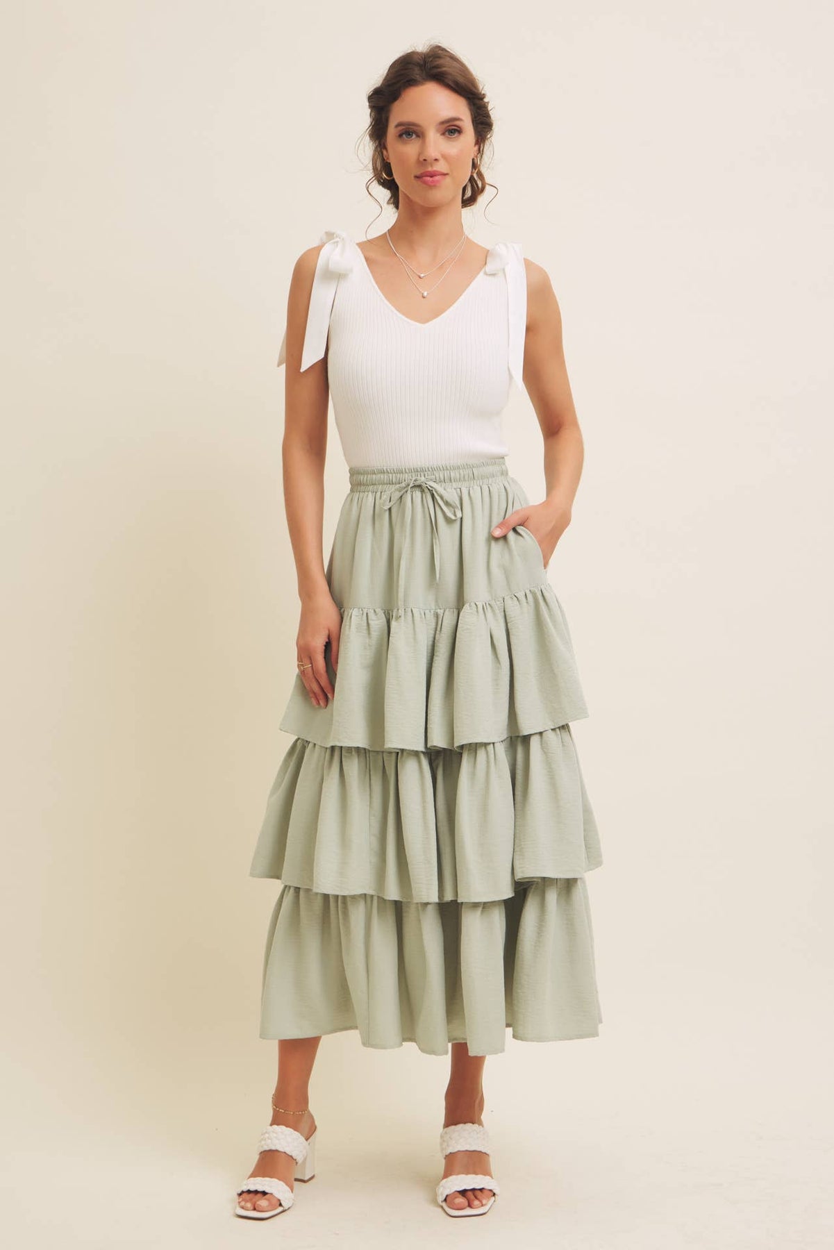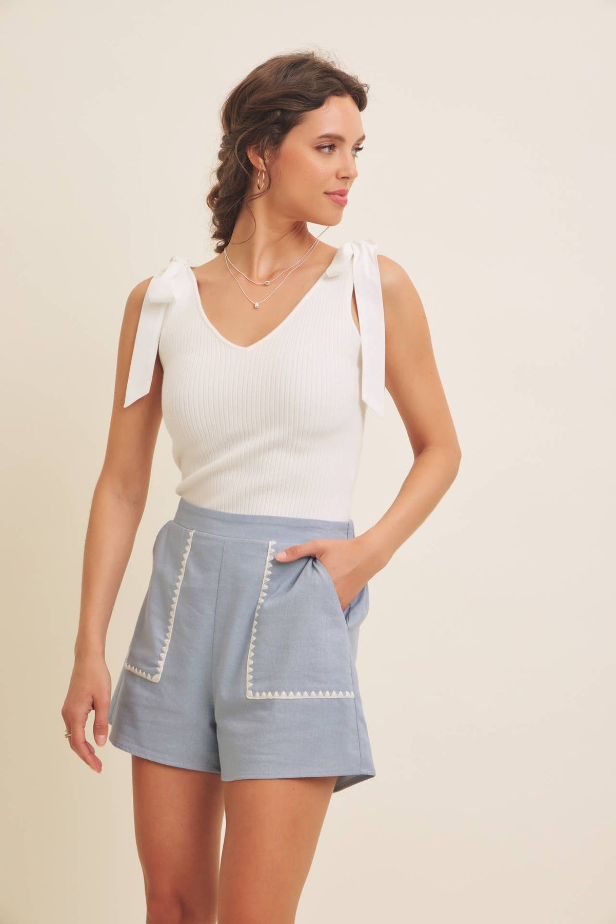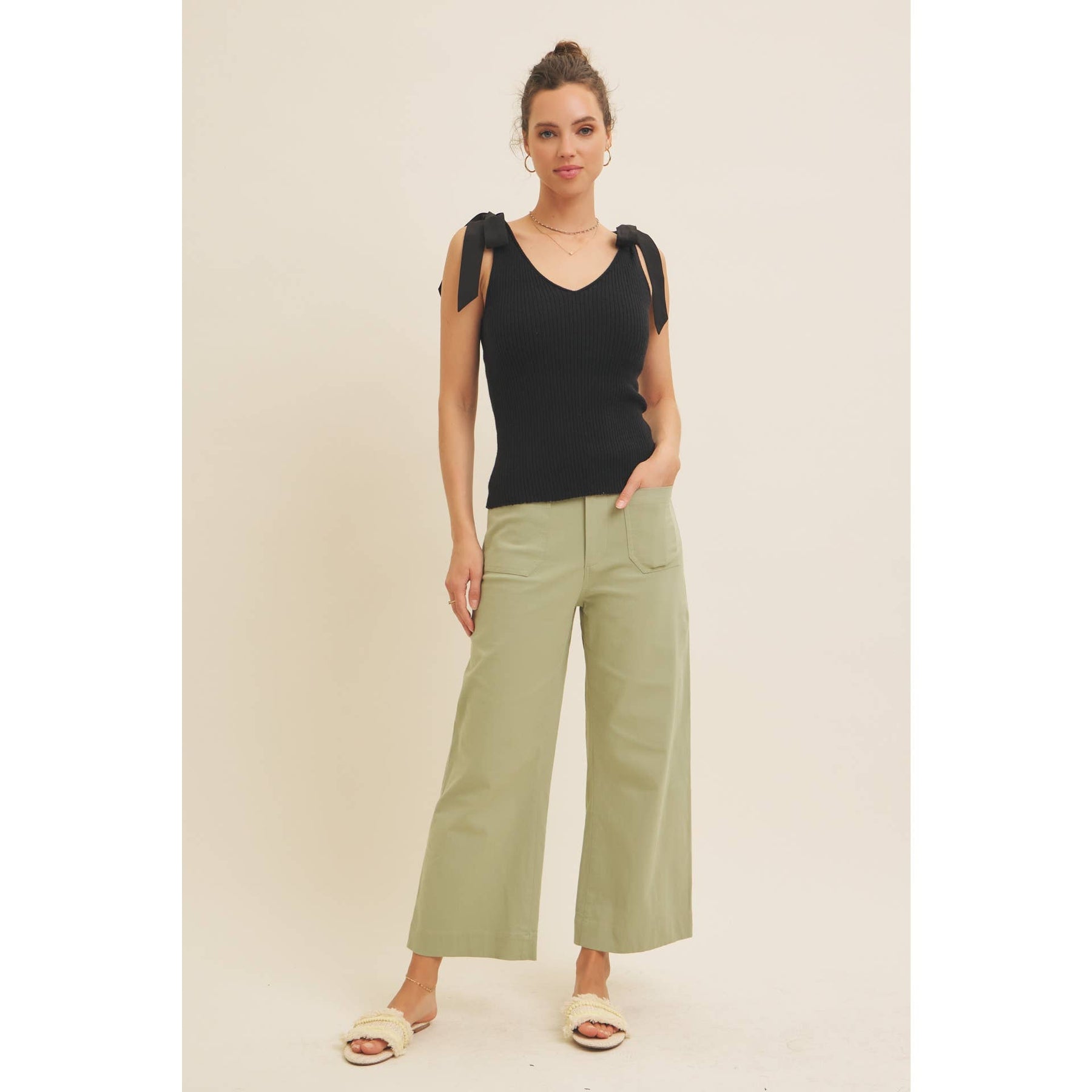 * Style No.: A2042SW Features - Mixed media - Shoulder ribbon tie - Stretchy rib sweater fabric - V-neckline Contents - SELF: 51% VISCOSE 28% POLYESTER 21% NYLON - CONTRAST: 100% POLYESTER Size + Fit Model is 5'9.5" and wearing a size Small. Please refer to our size chart.