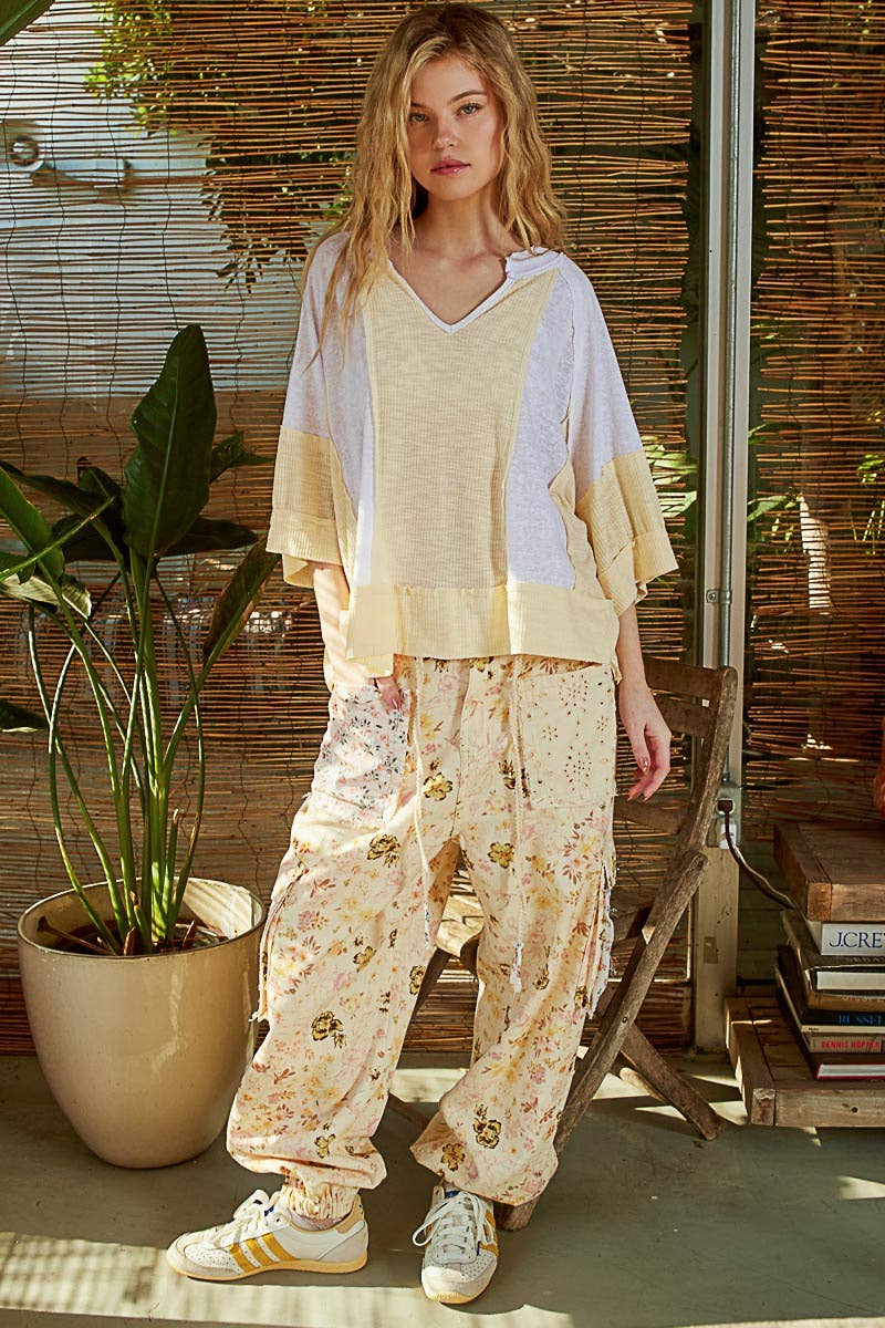Designed in notched neck half sleeve oversized fit knit top featured in cotton slub and rib, frayed edge on entire garment. Specs/Dimensions: - BUST: 30" - LENGTH: 23-1/2" - SLEEVE: 6-1/2" - SHOULDER: 30"