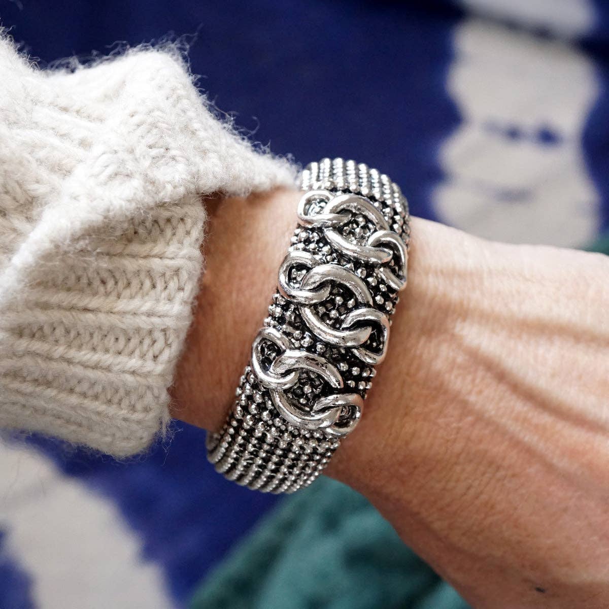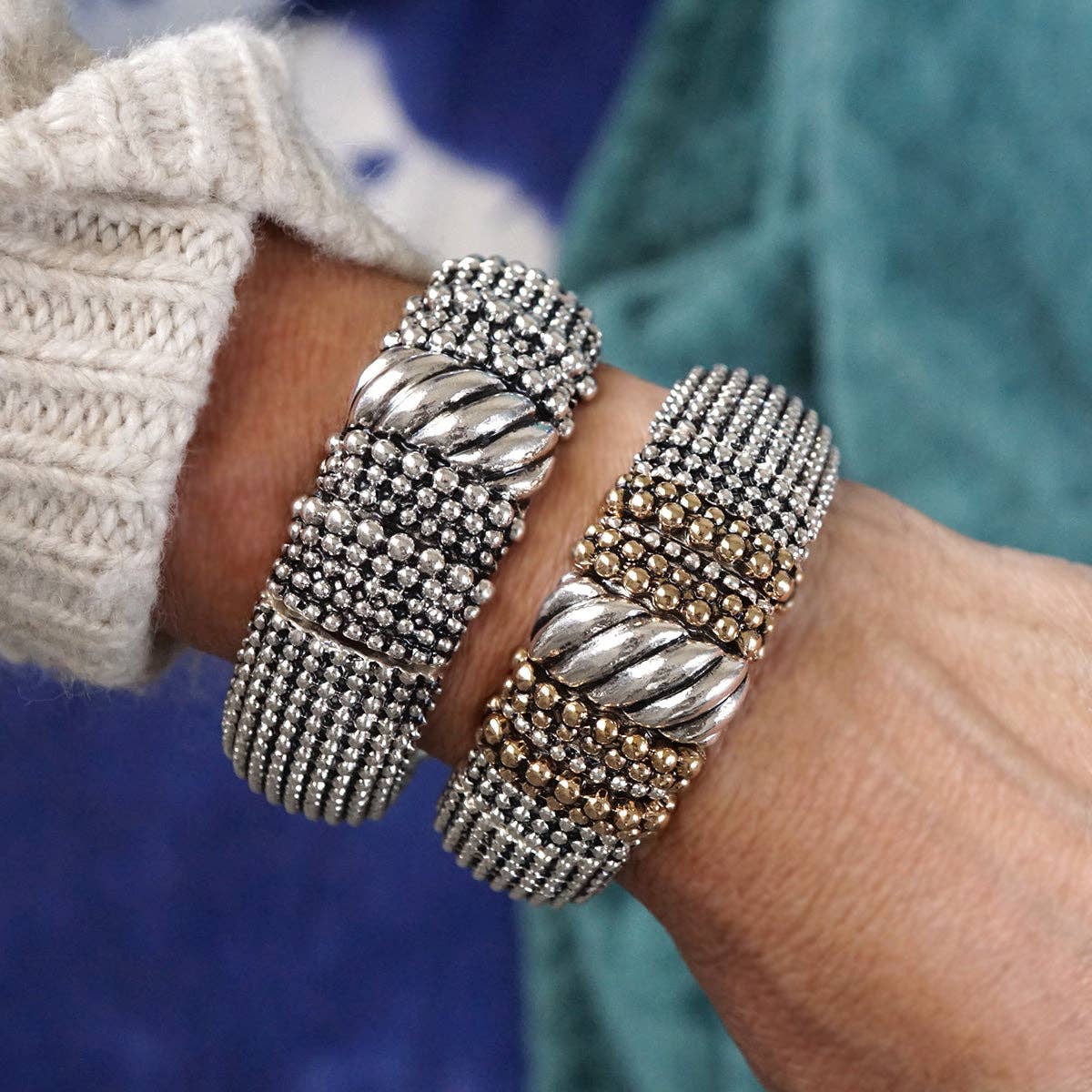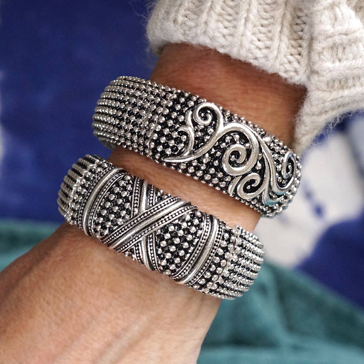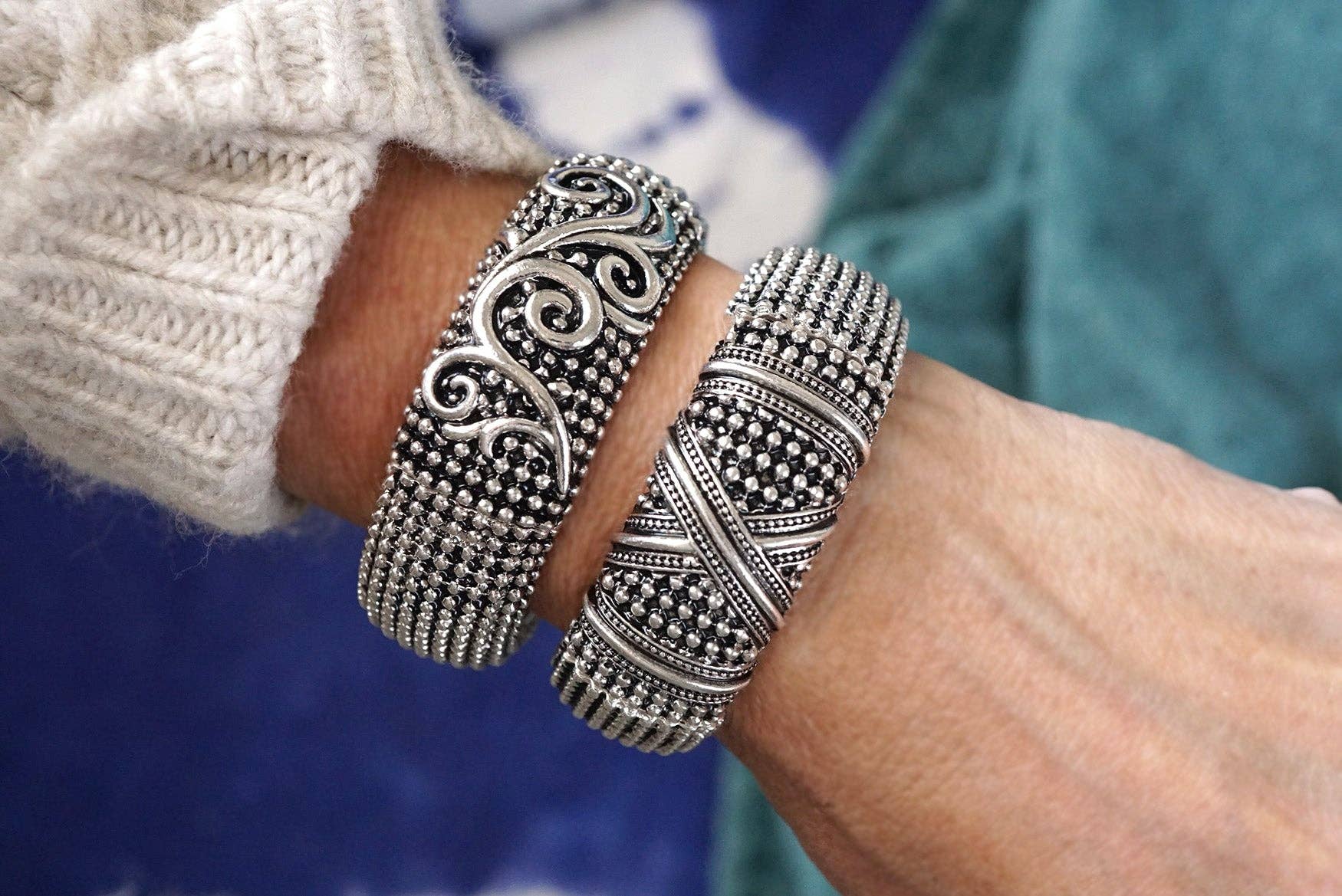 Bold yet timeless, these wide statement bangles bring a bohemian edge to classic silver tones. Each 1" wide cuff features a stretchy fit for easy layering, with rich caviar texture and intricate details—twist, chain, X, filigree, and two-tone variations add personality to your stack. Perfect for expressing your style with a nod to heritage and free spirit.