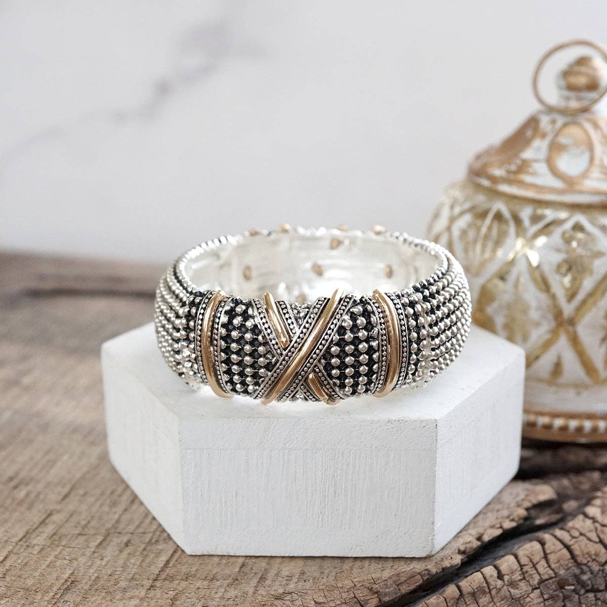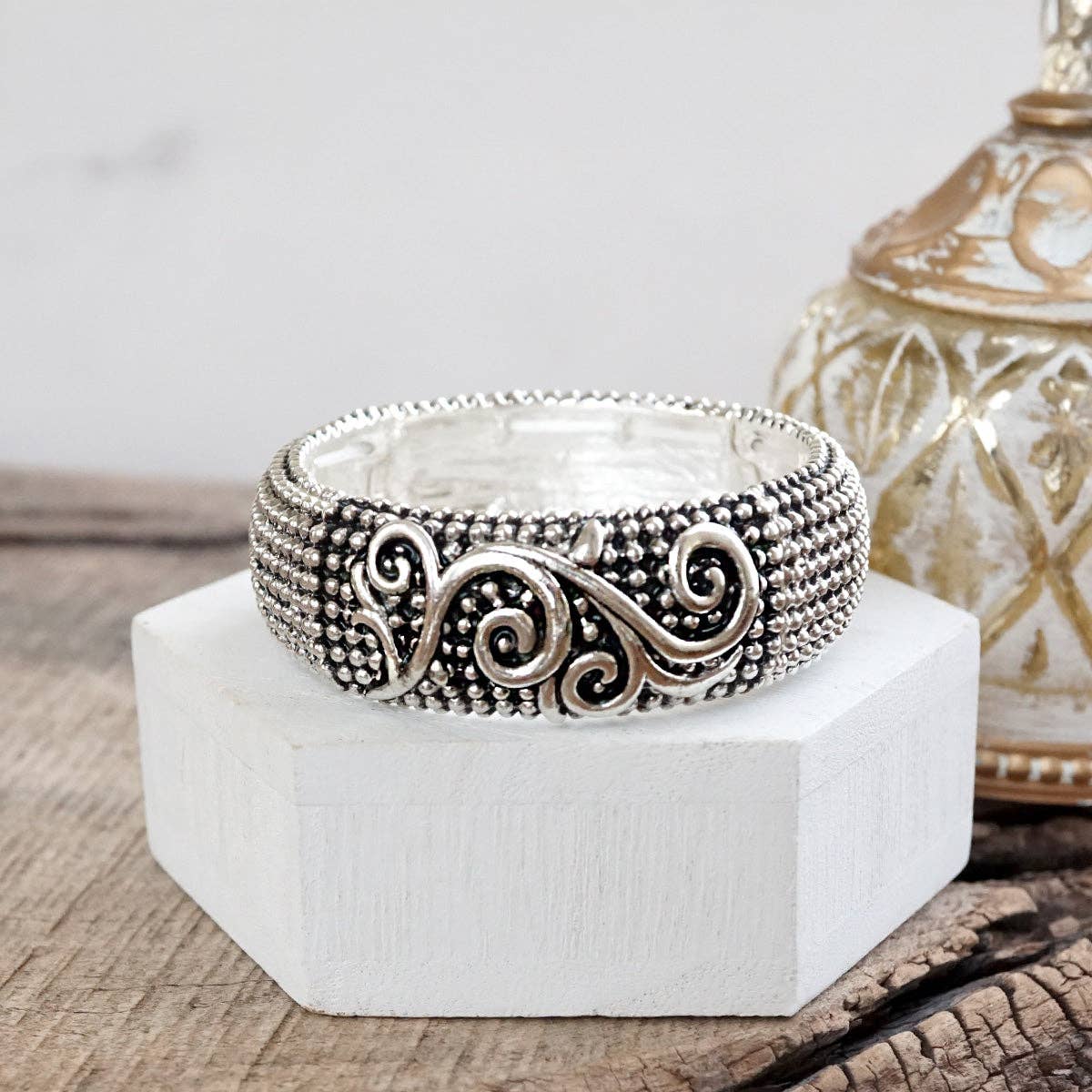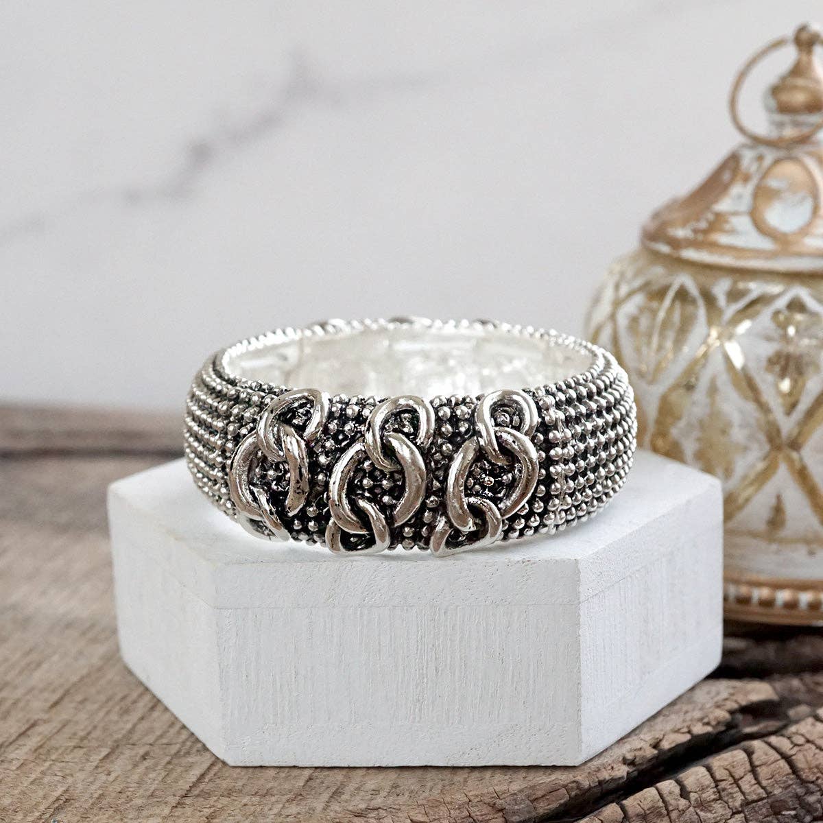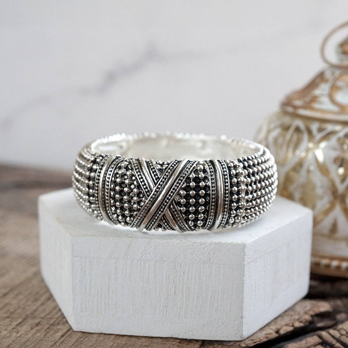 Bold yet timeless, these wide statement bangles bring a bohemian edge to classic silver tones. Each 1" wide cuff features a stretchy fit for easy layering, with rich caviar texture and intricate details—twist, chain, X, filigree, and two-tone variations add personality to your stack. Perfect for expressing your style with a nod to heritage and free spirit.
