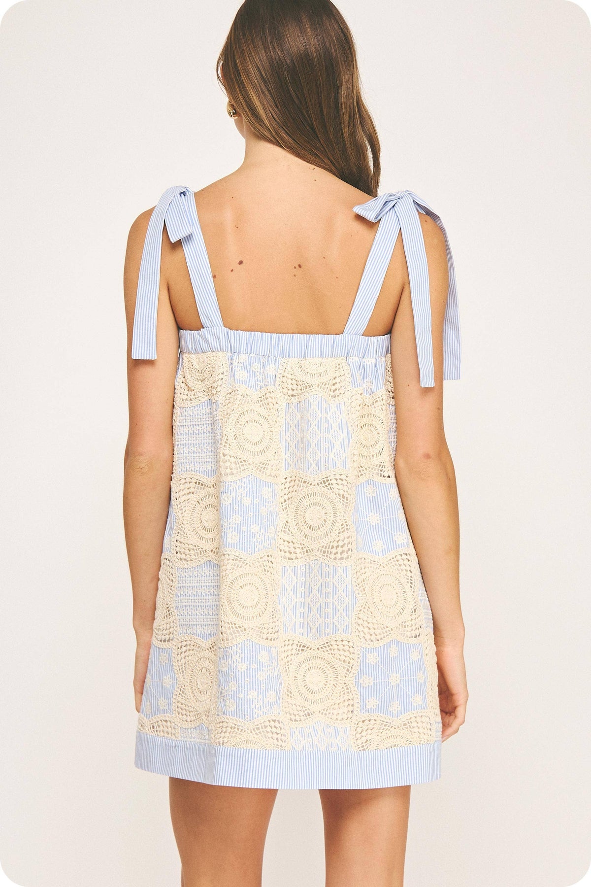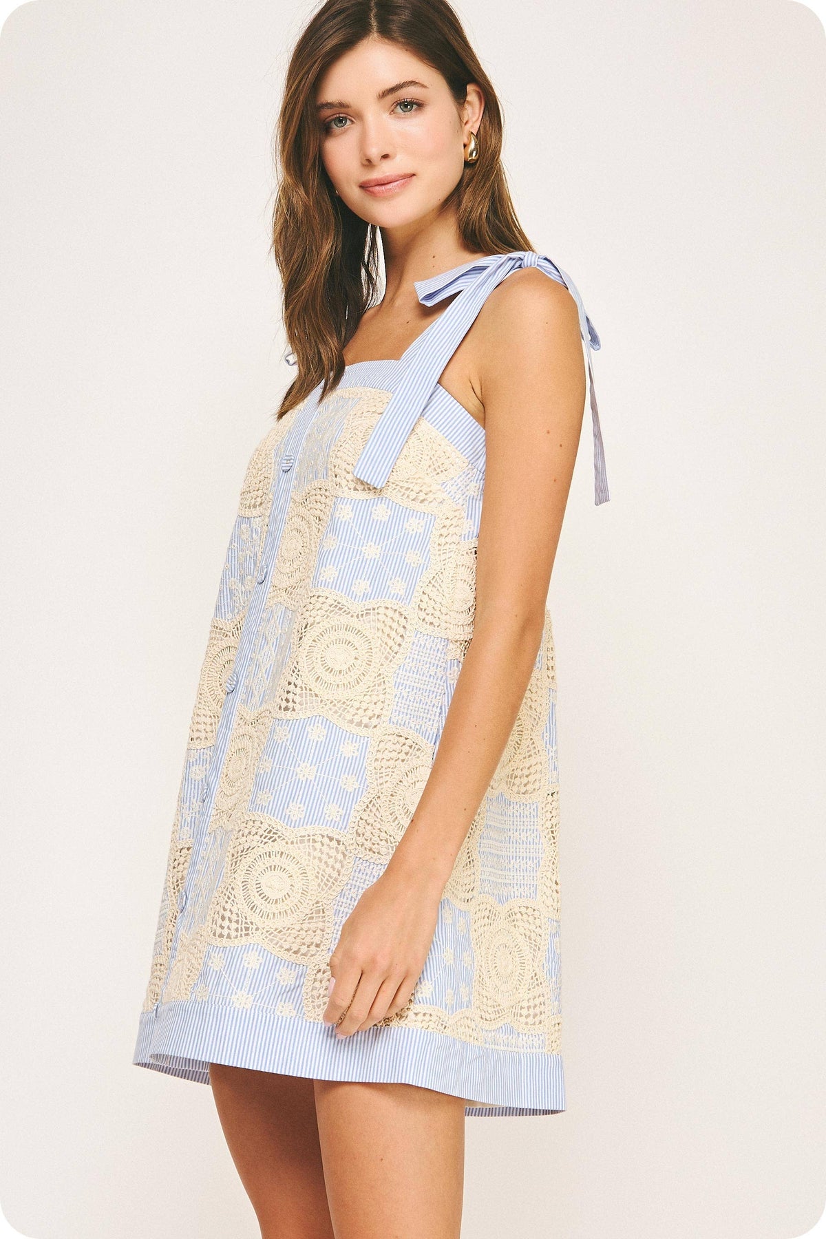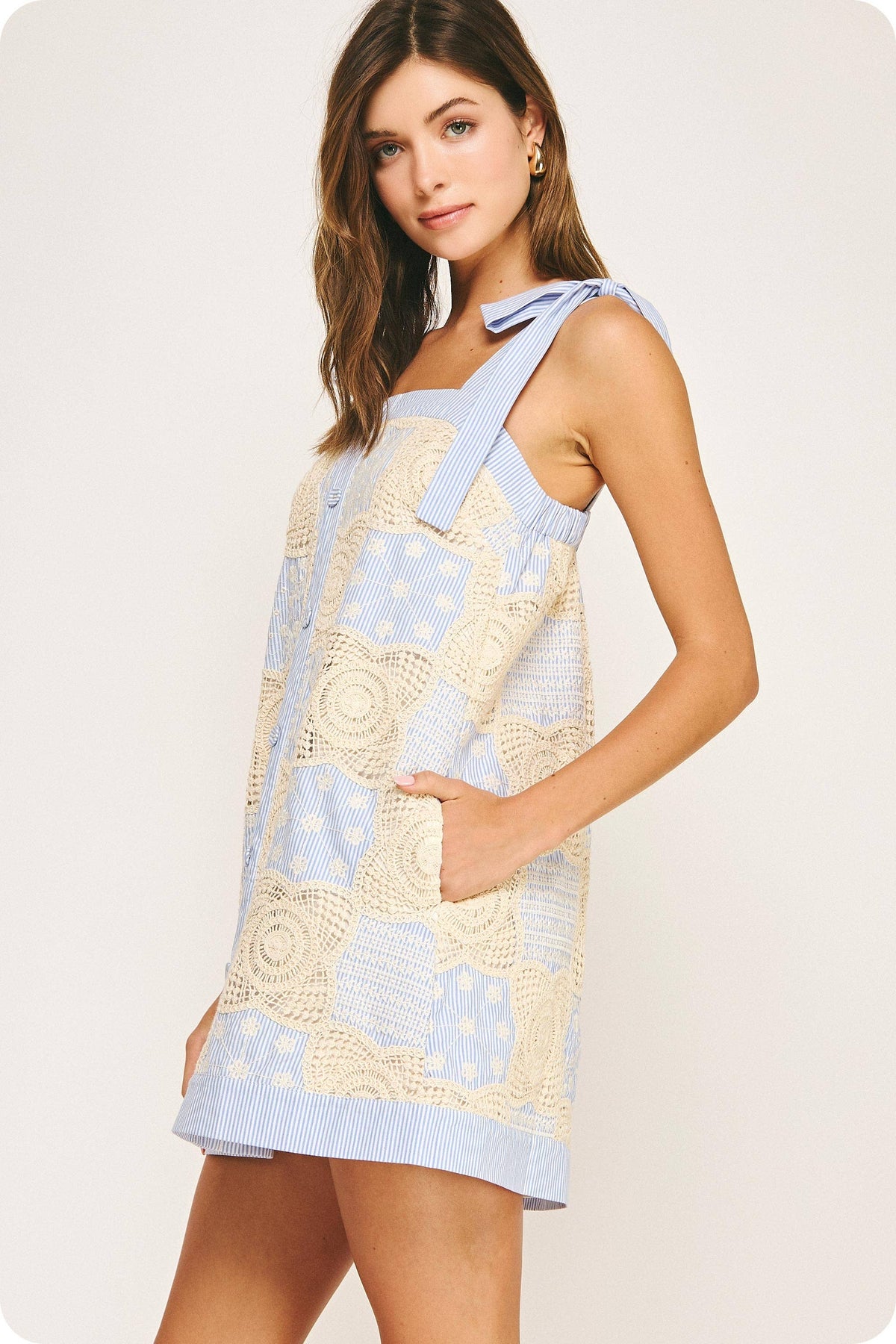Strut and Bolt Collection. Patchwork mini dress in knitted floral crochet and embroidered stripe poplin fabric. This style features patchwork mix of striped poplin fabric and crochet, adjustable self tie strap, button down detail at front, side pockets, square neckline with elastic at back, and lining.