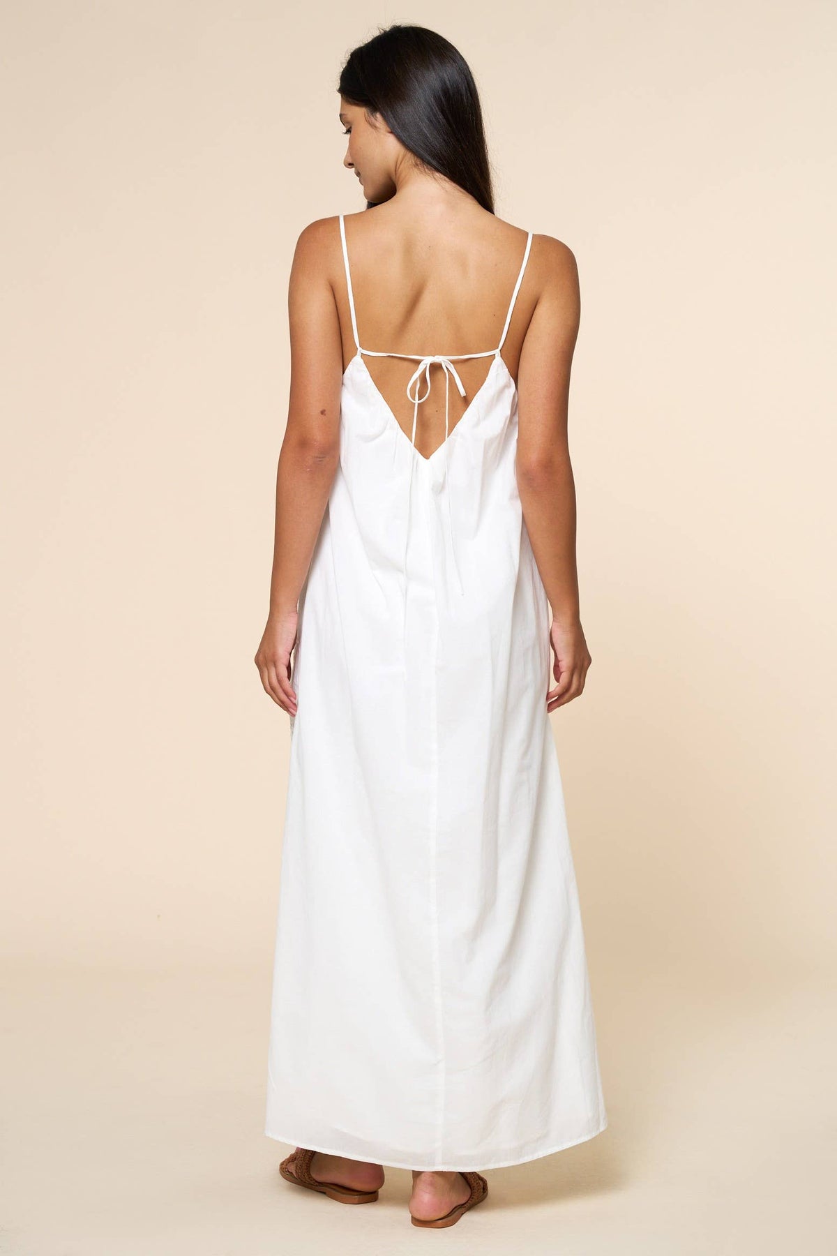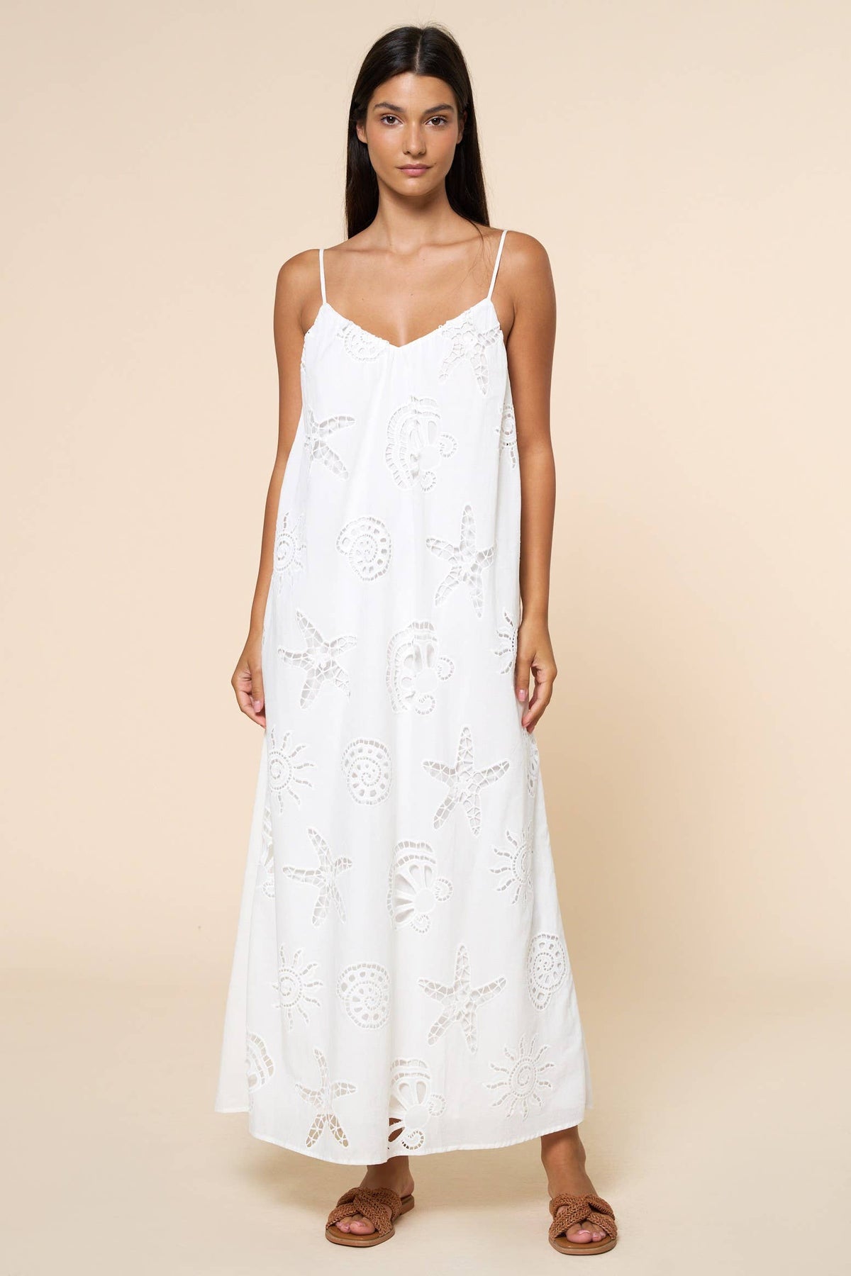 Embrace breezy elegance in this Star Fish Embroidery Eyelet Maxi Dress, featuring a V-neckline, adjustable back-tie spaghetti straps, and a loose, lined fit. Perfect for spring, summer, and beachside occasions, it combines effortless comfort with charming seaside-inspired style.