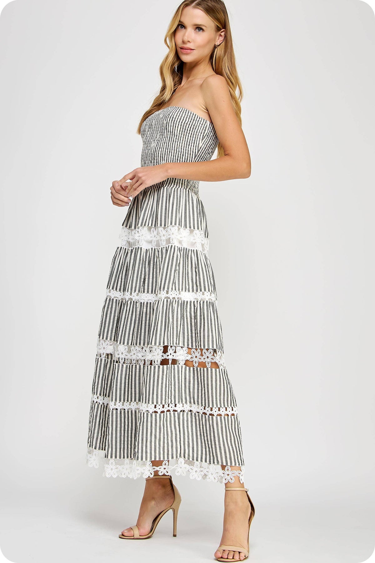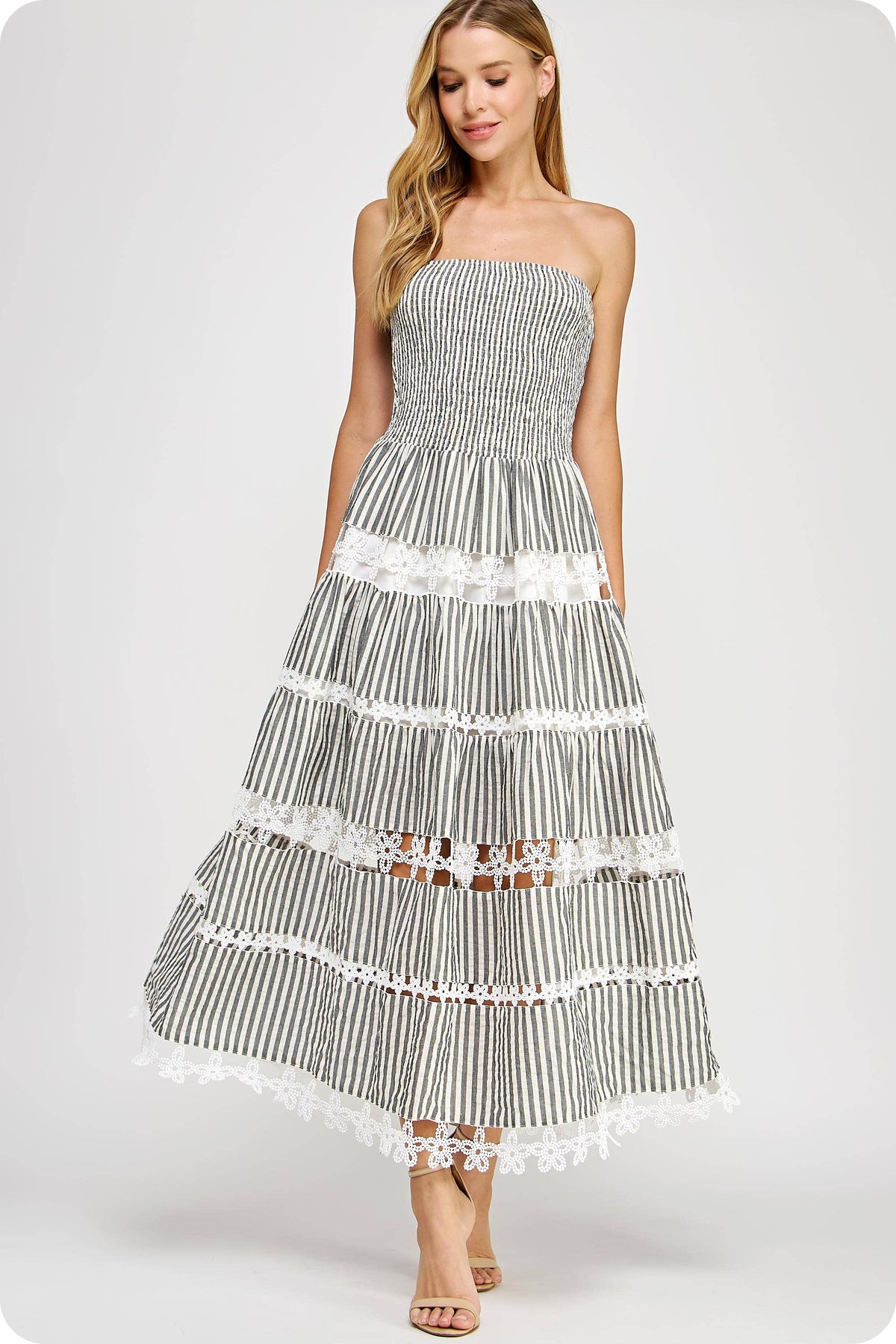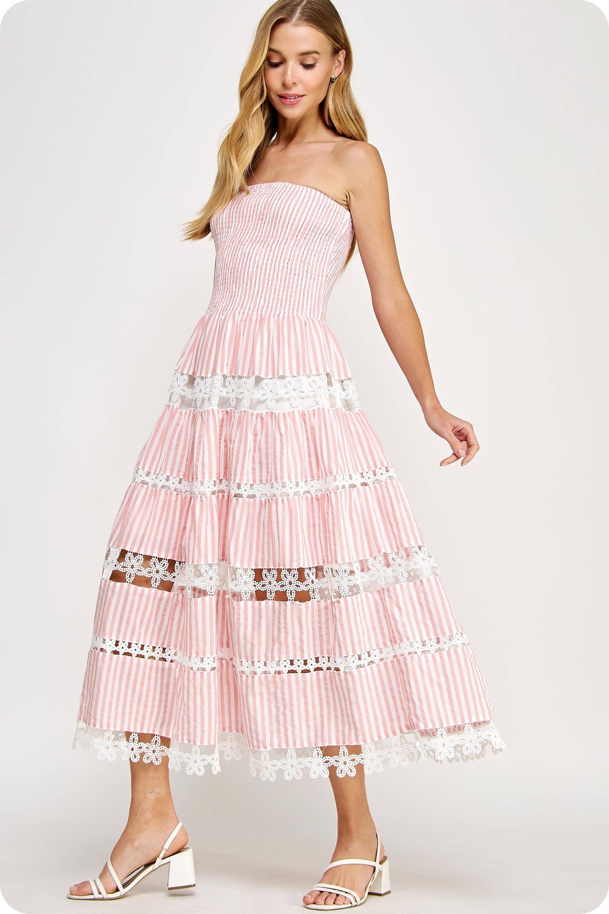 Tube strapless midi dress in stripe print on cotton/rayon fabric. This classic style features smocked tube bodice, midi length, scalloped lace trim at hem/skirt, and half lining for comfort.