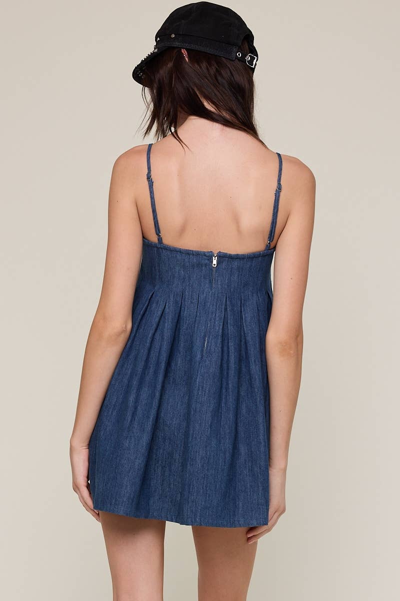 Washed Denim Print Square Neck Sleeveless Adjustable Strap Back Zipper Down Swing Mini Dress SELF:100%COTTON * Model Info: Height 5'10" Bust 32B Waist 23" Hip 33"