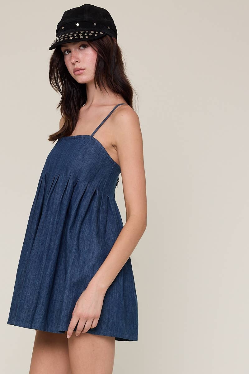 WASHED DENIM SQUARE NECK CASUAL SWING MINI DRESS